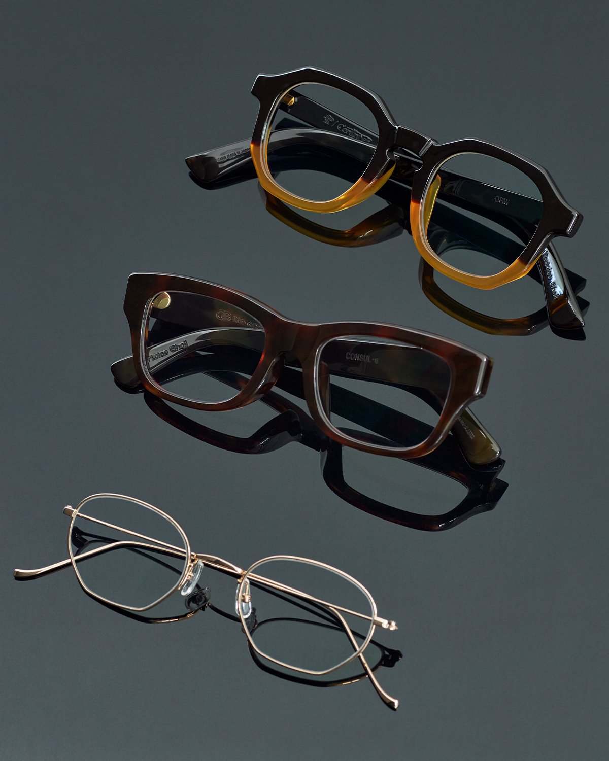 「オリバー・ゴールドスミス」からは、往年のスターたちに愛された英国のトラディショナルかつ時代を超えた新鮮さを感じる名作の数々を本鼈甲で復刻したプロダクトの数々。「/コンティニュエ」では、Continuer 本店開業からの20 年の歴史の中で養った審美眼を活かし、通常の本鼈甲フレームではあまり見ることのないフォルムやカッティングを取り入れた唯一無二のプロダクトを、本鼈甲の生産において日本を代表する名工房である「大澤鼈甲」とのコラボレーションにより実現させた。