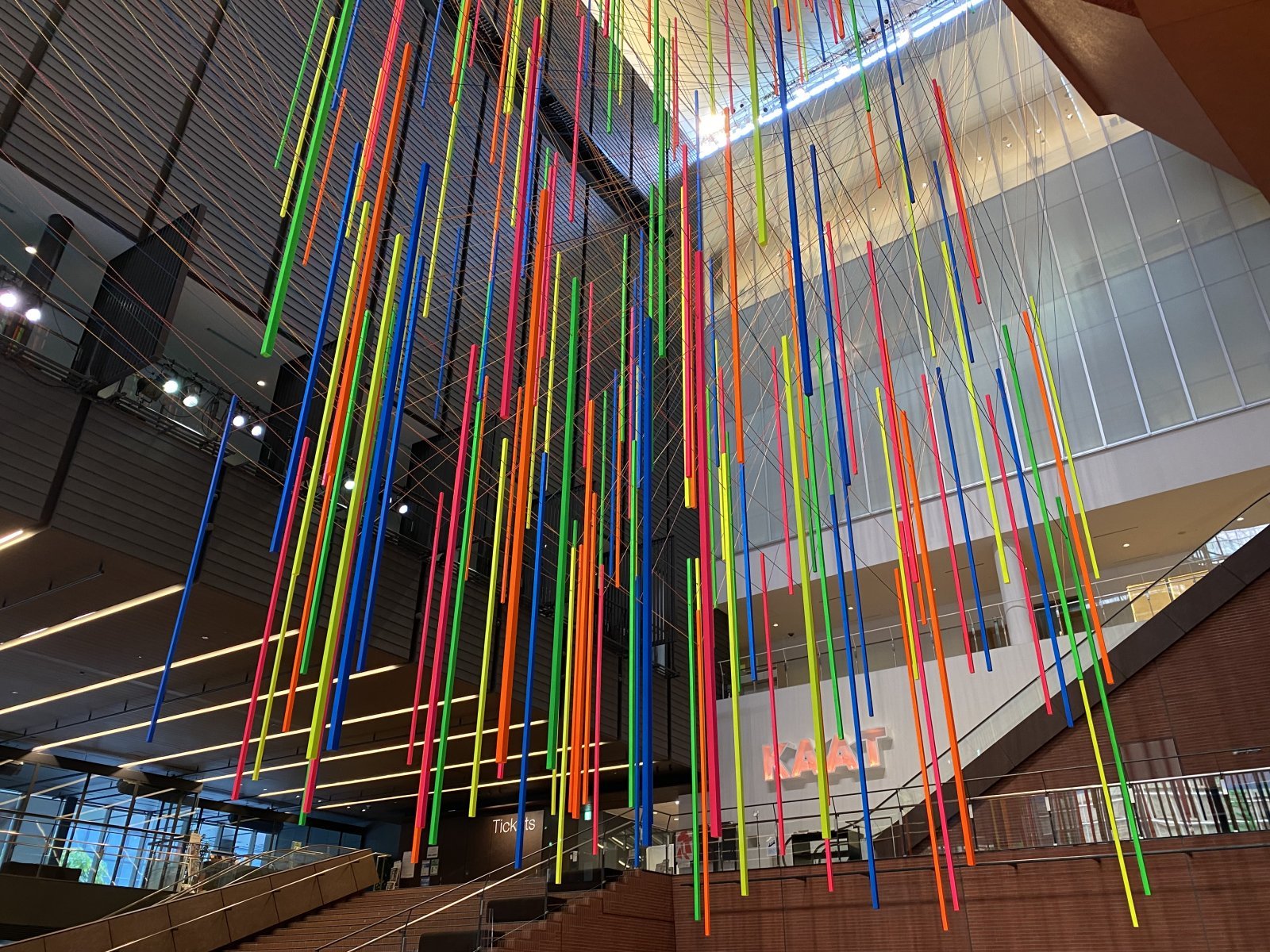 下から見上げると空間を埋めるような色彩美に圧倒されるが、さまざまな角度や高さから鑑賞するのもおすすめだ。アトリウムではエントランスから2階、それに中スタジオのある3階、さらに踊り場を経て5階のホールへとエスカレーターが螺旋状に連なっている。よって5階に上がれば作品を見下ろせるだけでなく、角材が色とりどりのロープによって吊るされている光景も目の当たりにできるのだ。巨大な色彩のシャワーが劇場を祝福するように流れている。