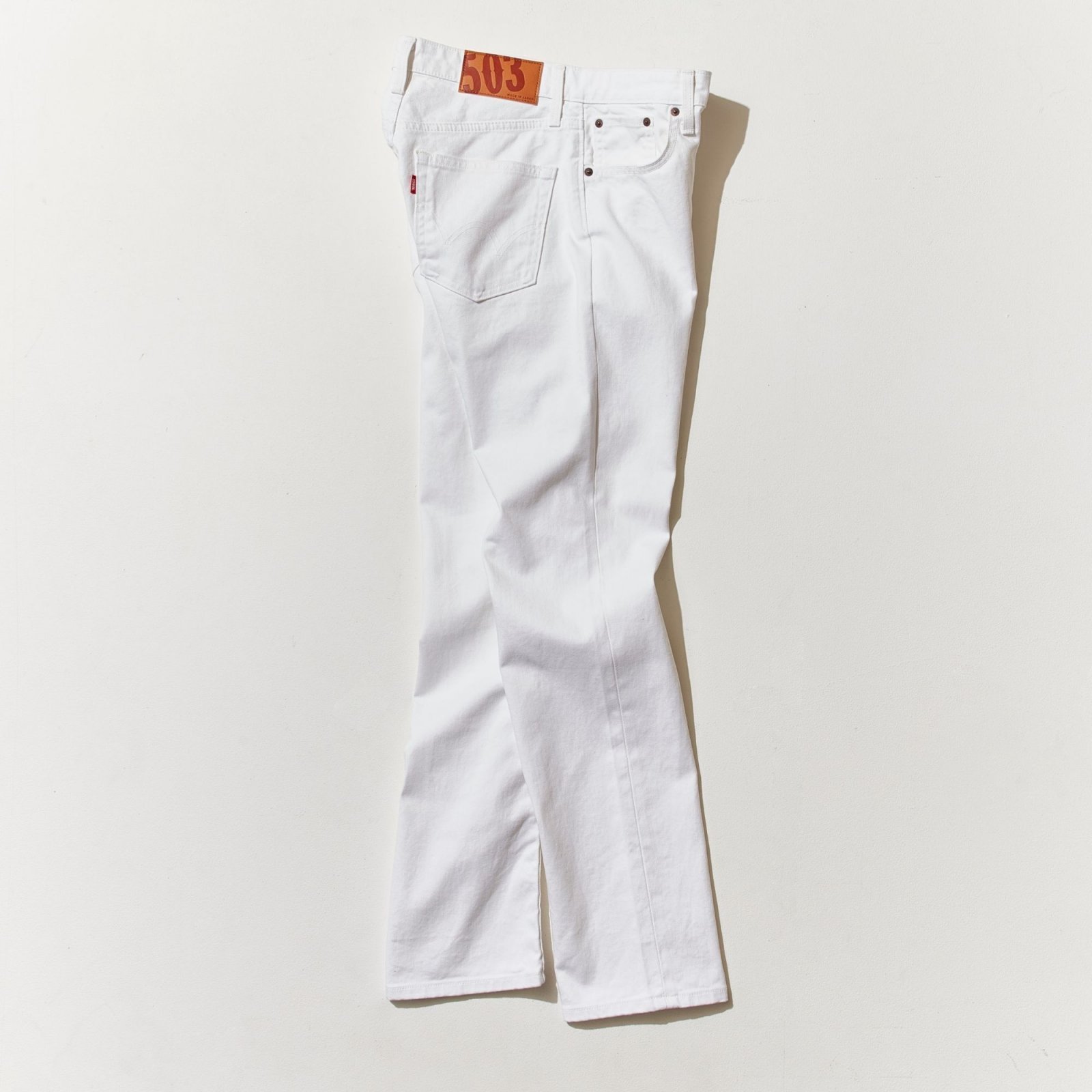 その後60年代も後半になると、ヒッピームーブメントを受けてジーンズのデザインは大きく変化する。シルエットもストレートからフレアやベルボトムなども登場し、はき込んだ色合いのデニムや、ときにはパッチワークを施したジーンズなども登場する。そういう意味ではホワイトジーンズはその狭間に登場したデニムと見てもいいだろう。しかし清潔さを備え、オールマイティに使える魅力はいささかも薄れてはいない。もっと注目していい一本と言える。