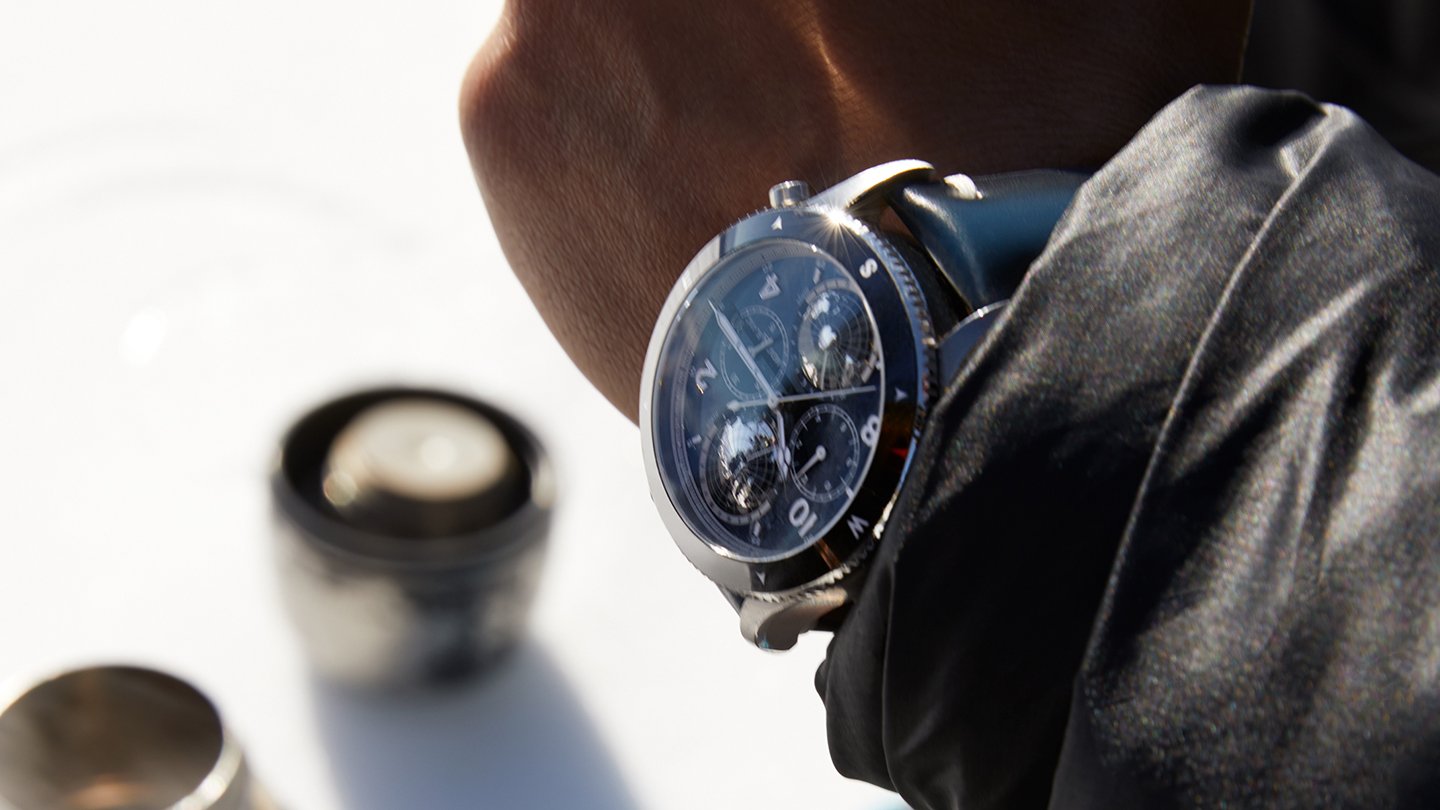 ケースはスチールより軽量で耐食性にも優れたチタン製。マットではなく、メタリックな光沢のポリッシュで仕上げており、ダイヤルは奥ゆきを感じさせるグレイシャーブルー。このブルーダイヤルに、伝統的な装飾技法のグラッテボワゼによる積層した氷河を想わせる複雑な模様が描かれている。外周には方位が刻まれた双方向回転ベゼルをセット。艶消しサテン仕上げのブラックセラミックが、時計全体のシルエットを引き締めている。