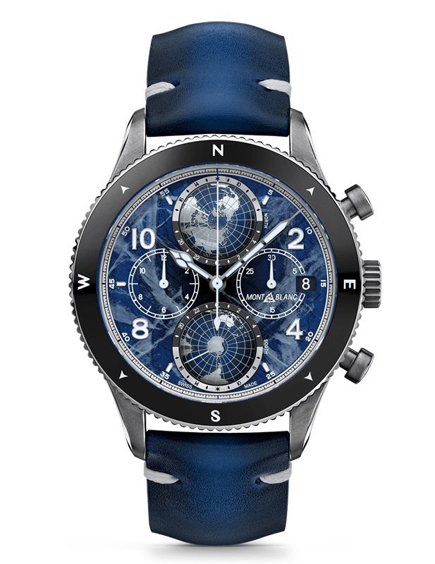 人体がもつ驚異的な可能性を実証した彼の手首に巻かれていたのが、モンブランの「1858 ジオスフェール クロノグラフ ゼロ オキシジェン」だ。12時位置に北半球、6時位置に南半球を模したドームを搭載。その周囲にデイ&ナイト表示付きの24時間計があり、2つのドームは1日24時間で1回転する。いわば向きが真逆の2つの自転する地球を、ダイヤルの上下に配置したと表現できる。この独創的なワールドタイムは、登山家たちの究極の目標である世界7大陸登頂制覇に捧げるモデルとして2018年に発表された。