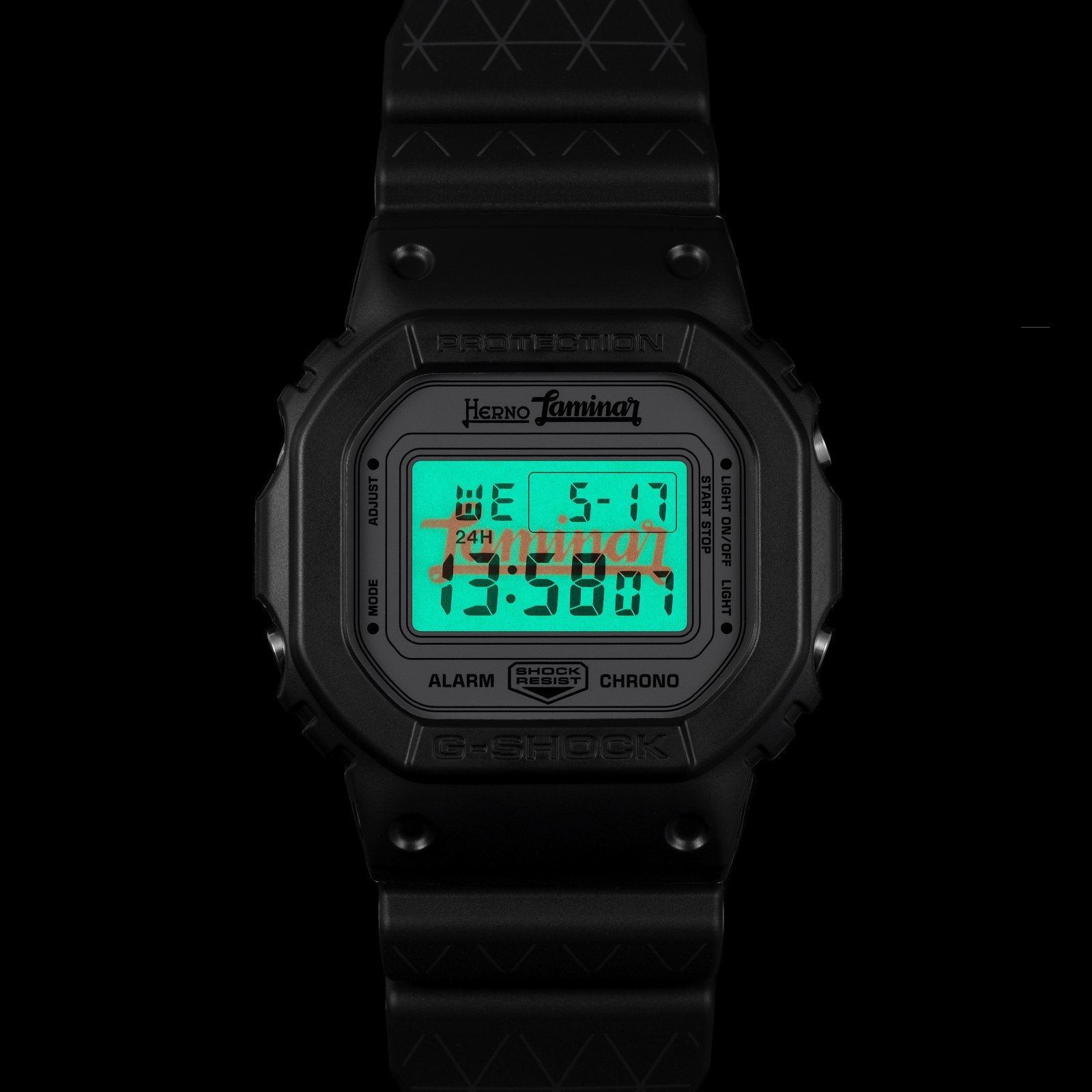 ベースモデルには初代のフォルムを受け継ぐ「DW-5600」を採用し、コンセプトカラーであるブラックのベルトには、最新コレクションでも用いられたモチーフの一つ、イヌイットの雪の家 “イグルー”から着想を得た、グレーの三角格子ラインが施される。文字盤や裏蓋、バックライト、ベルトが重なる位置に配した「Laminar」のロゴが、さりげなくも特別感を薫らせるヘルノらしい仕上がりだ。