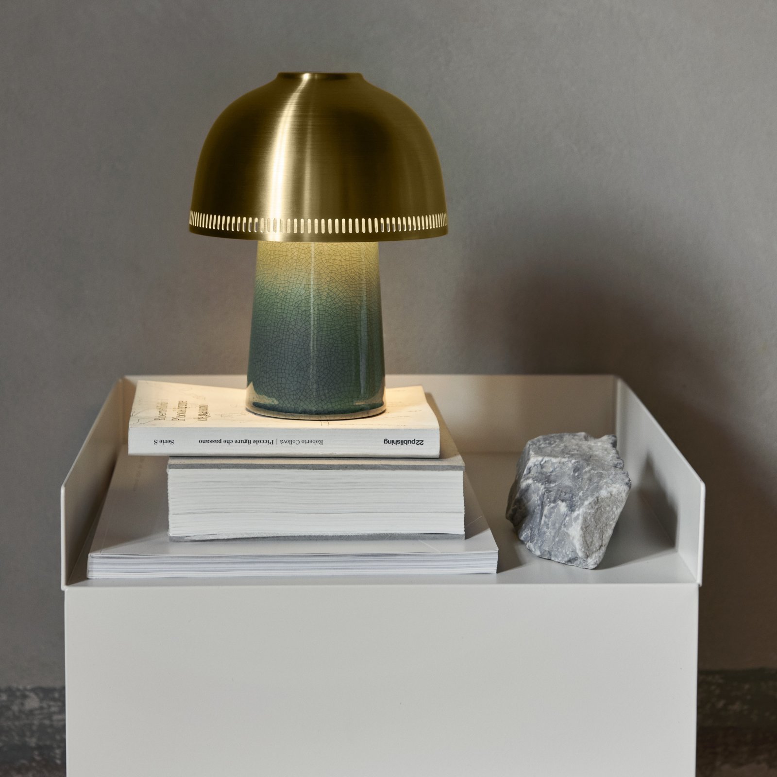 セバスチャン・ヘルクナーのテーブルランプ「ラク(Raku)」がデンマークのデザインブランド、アンドトラディション(&Tradition)から登場。楽焼を想起させるネーミングの通り、日本の伝統技術が発想源になっている。ハンドメイドの台座は釉薬の表情が個々に異なり、金属製のシェードとの対比によってさらに工芸的な魅力を纏う。シェードはブロンズまたは真鍮製(写真)の2種。モダンでありつつ、素材の特性を活かした照明に仕上げられている。