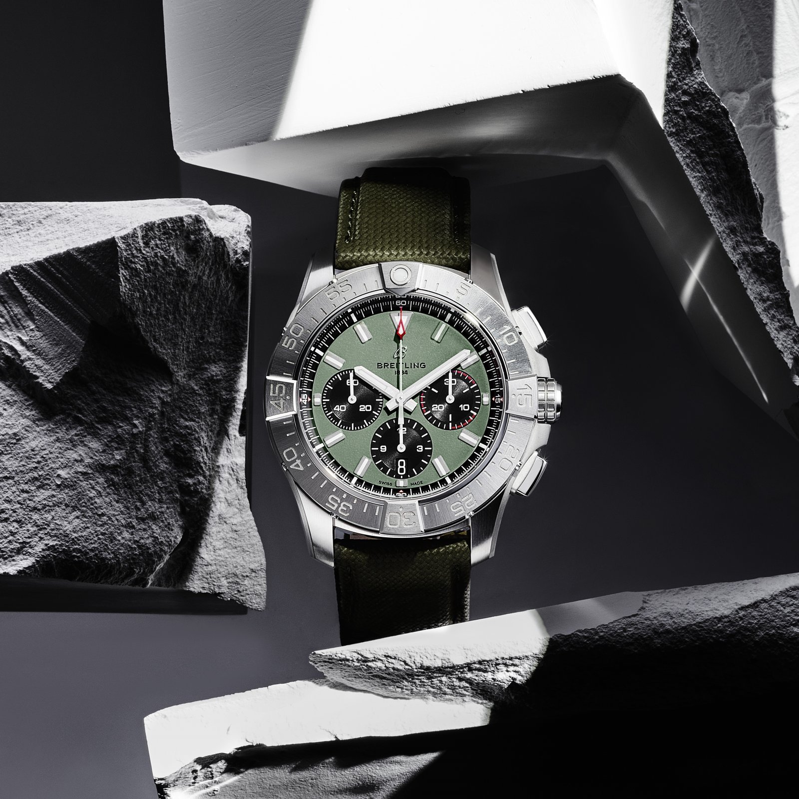 もともとはジェット機のパイロット向けに製作され、タフなデザインで人気を得ていた「アベンジャー」が、このたびフルモデルチェンジを果たした。ラチェット式回転ベゼルは誤動作を防ぐ逆回転防止機能付き。天地左右に配置されたライダータブは、パイロットがグローブをはめた指先でもスムーズに操作できるブライトリング固有のディテールで、クリックのレスポンスも快適だ。