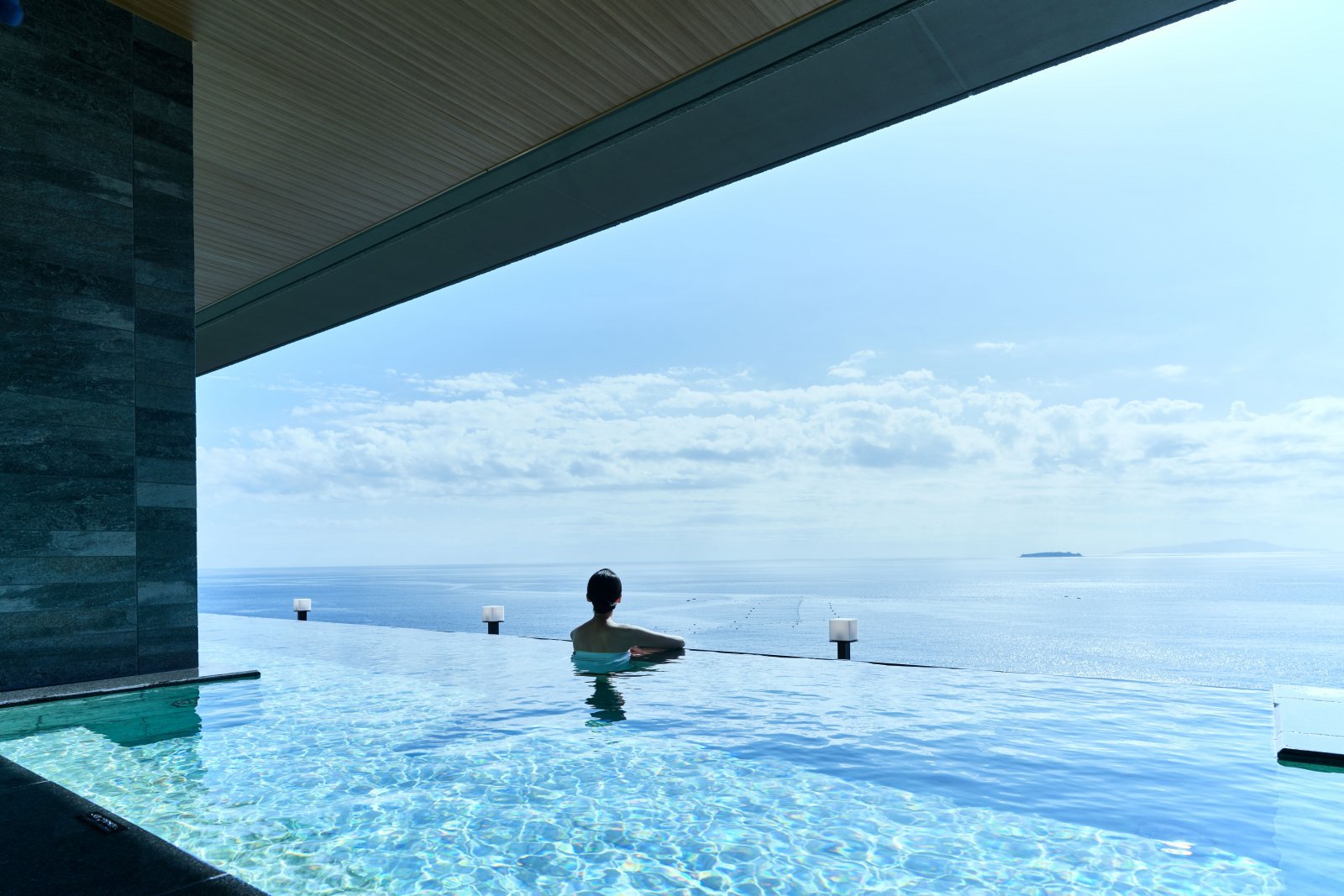 ラウンジにはテラスも併設され、そこにはまるで海と一体となるかのような水盤が広がり、心地よい潮風に包まれる。ここではぜひ、この眺望に酔いしれながら足湯に浸かりたい。都会の喧騒を忘れ、心身を非日常へと誘うスイッチになるはずだから。