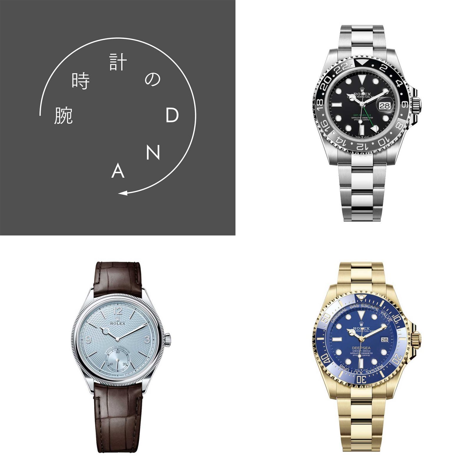 右上:高い人気を誇る「GMTマスターⅡ 」にグレー/ブラックの機能美あふれるセラミックベゼルを搭載したSSモデルが登場した。 右下:プロ仕様の本格ダイバーズにあえてフルゴールドを組み合わせ、ラグジュアリーな風格が漂う「ロレックス ディープシー」。 左下:1931年の初代「オイスター パーペチュアル」の持つクラシックと現代的なスピリットを再解釈した「パーペチュアル 1908」。文字盤をモダンなアイスブルーと繊細なギョーシェで彩る。
