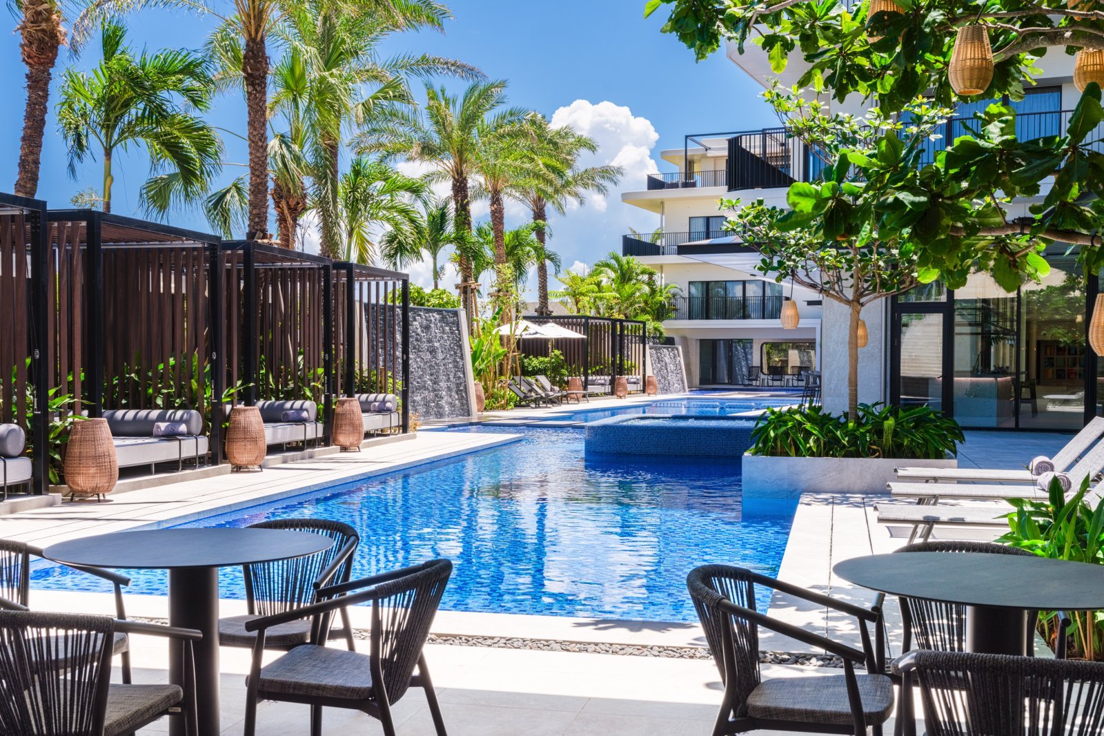 プール、サウナ、ラウンジバーなどの施設が充実しているセブン バイ セブン 石垣では、朝起きてから夜ベッドに入るまで、ホテルの敷地内でラグジュアリーな南国のヴァカンス体験に没入できる。なかでも客室棟に囲まれた中庭のようなプールエリアは、セブン バイ セブン 石垣の顔とも言える人気スポットだ。