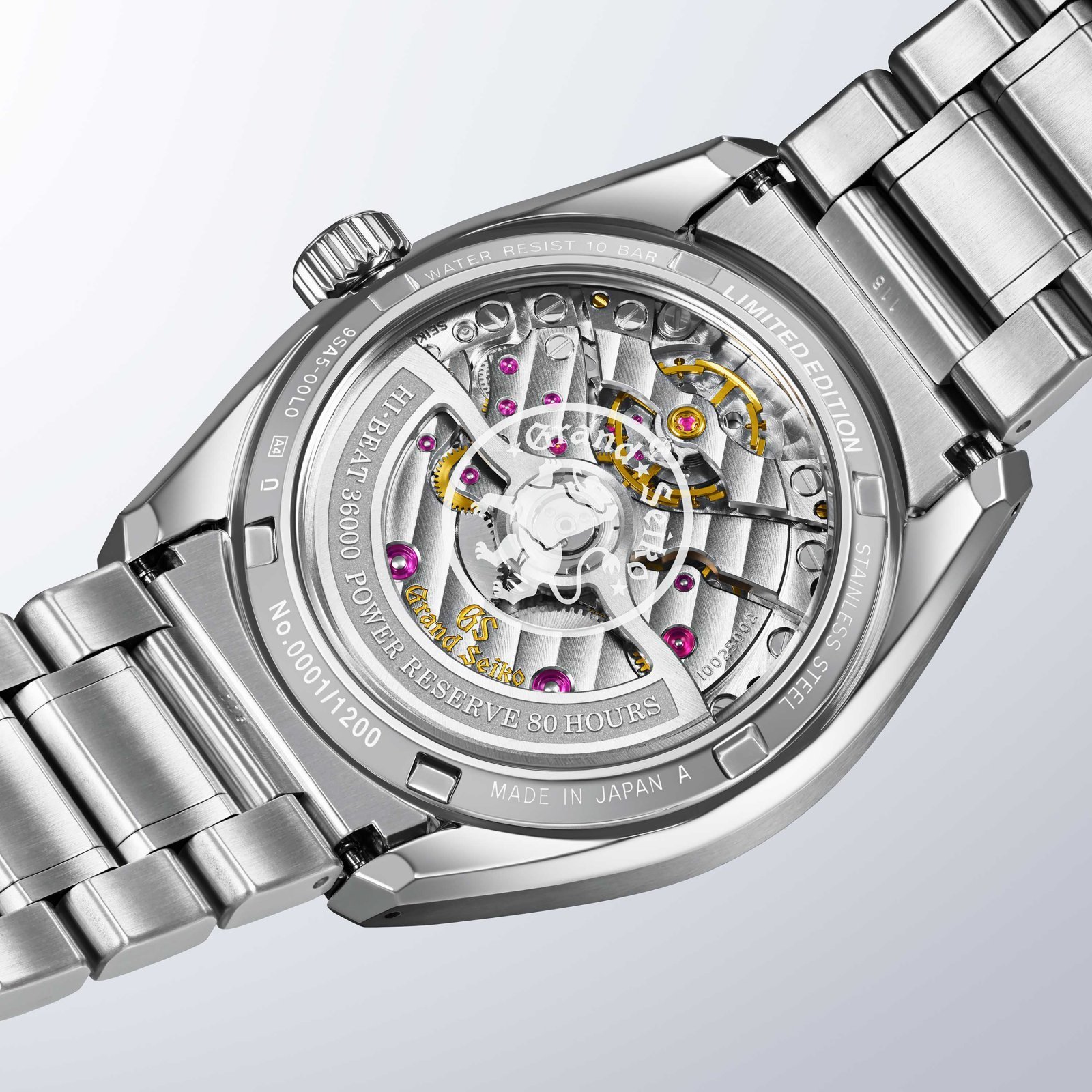 搭載する「キャリバー9SA5」も約80時間の駆動を可能にする魅力的な高性能機だ。シースルーバックから覗くムーブメントには、雫石の自然から着想を得たという繊細なストライプの「雫石川仕上げ」が施されている。