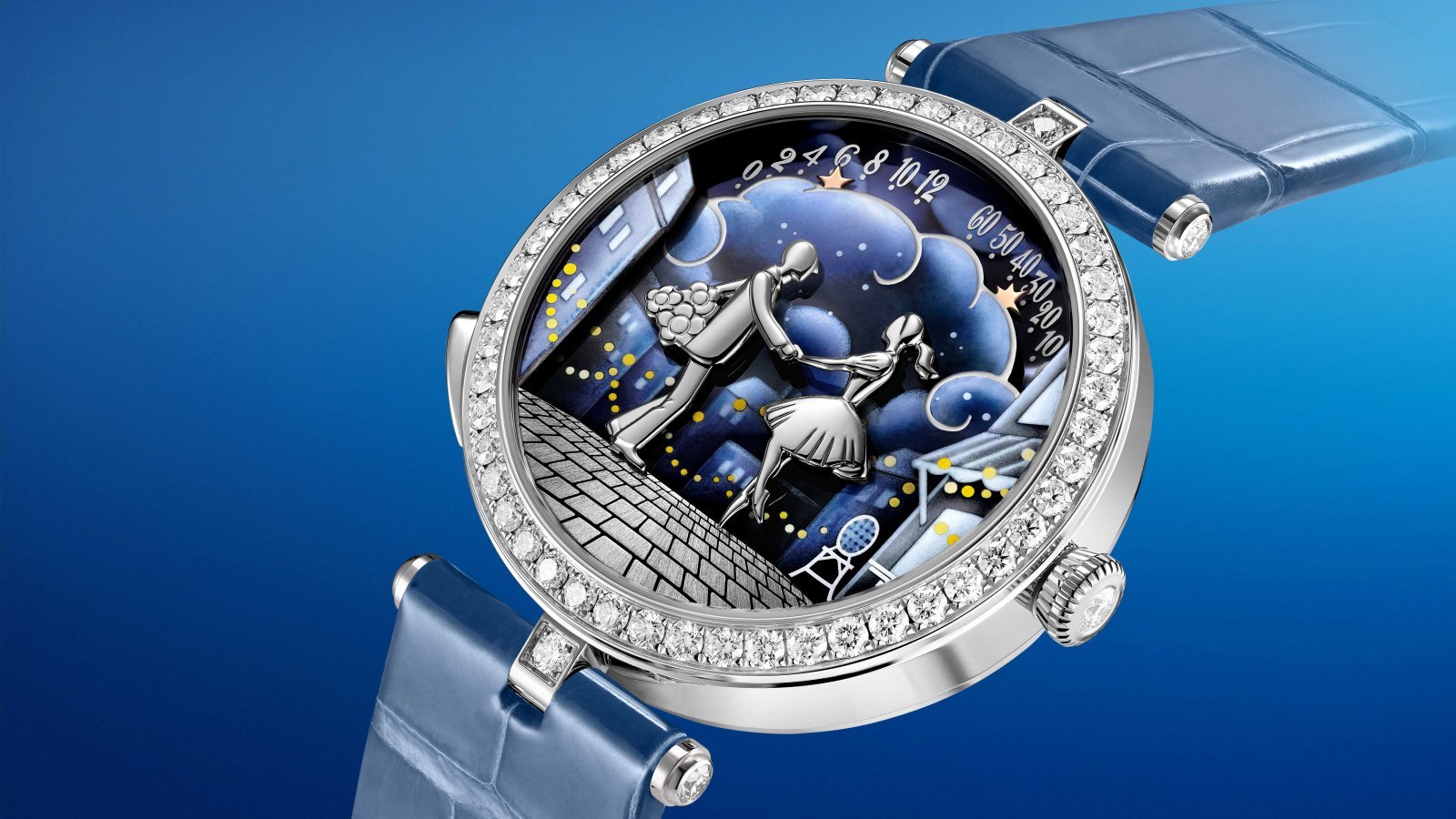 こうして愛を育んだふたりの物語は、より詩情豊かに語られる。新作「レディ アーペル バル デ ザムルー ウォッチ(以下バル デ ザムルー)」だ。19世紀にパリやその周辺で人気を博した屋外のダンスホール「ギャンゲット」で、手を取りあった恋人たちがキスを交わす。
