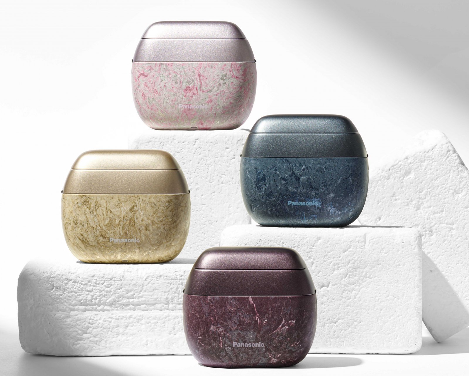 そんな電気シェーバー界の気鋭「ラムダッシュ パームイン」に、パナソニックのシェーバー事業70周年を記念した4色のスペシャルなモデルが追加された。ボディにはこれまでも使われてきた石目調デザインのイノベーティブ複合材「NAGORI®」を使い、「桜」「藍」「金」「紫」という日本的で自然な美しさを持つ色みで表現している。