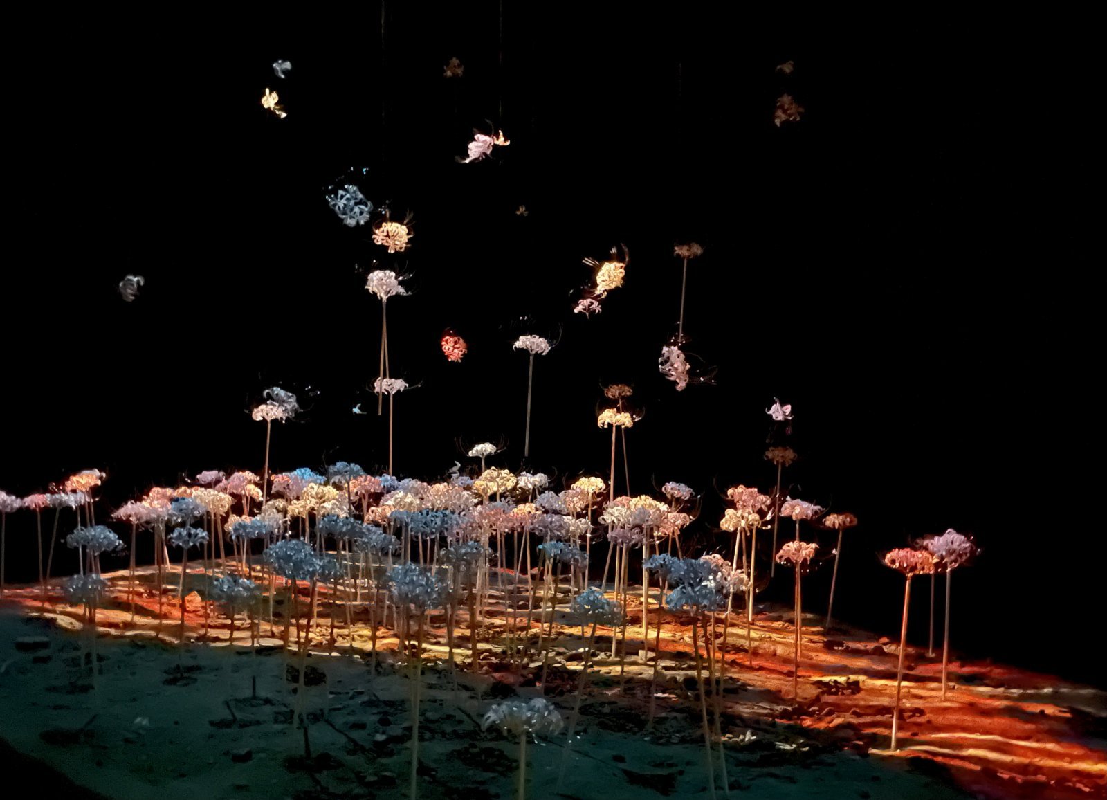 スロベニア出身のエヴァ・ぺトリッチが布片から構成した『第2の空、集合の夢』も美しい景色をつくり上げている。素材は世界各地より収集されたリサイクルの手づくりレースやドイリー。それらをつなぎ合わせつつ吊るすことで、大気と海、身体と大地、記憶と物質の境界が溶け合い、絶えず生成し続ける世界を描き出している。