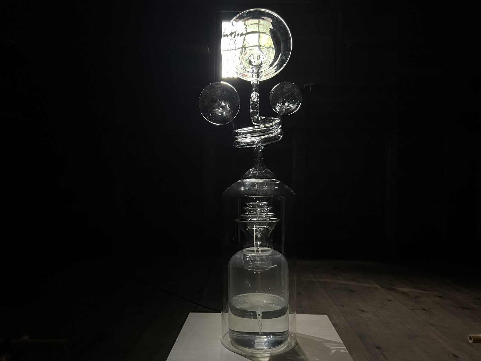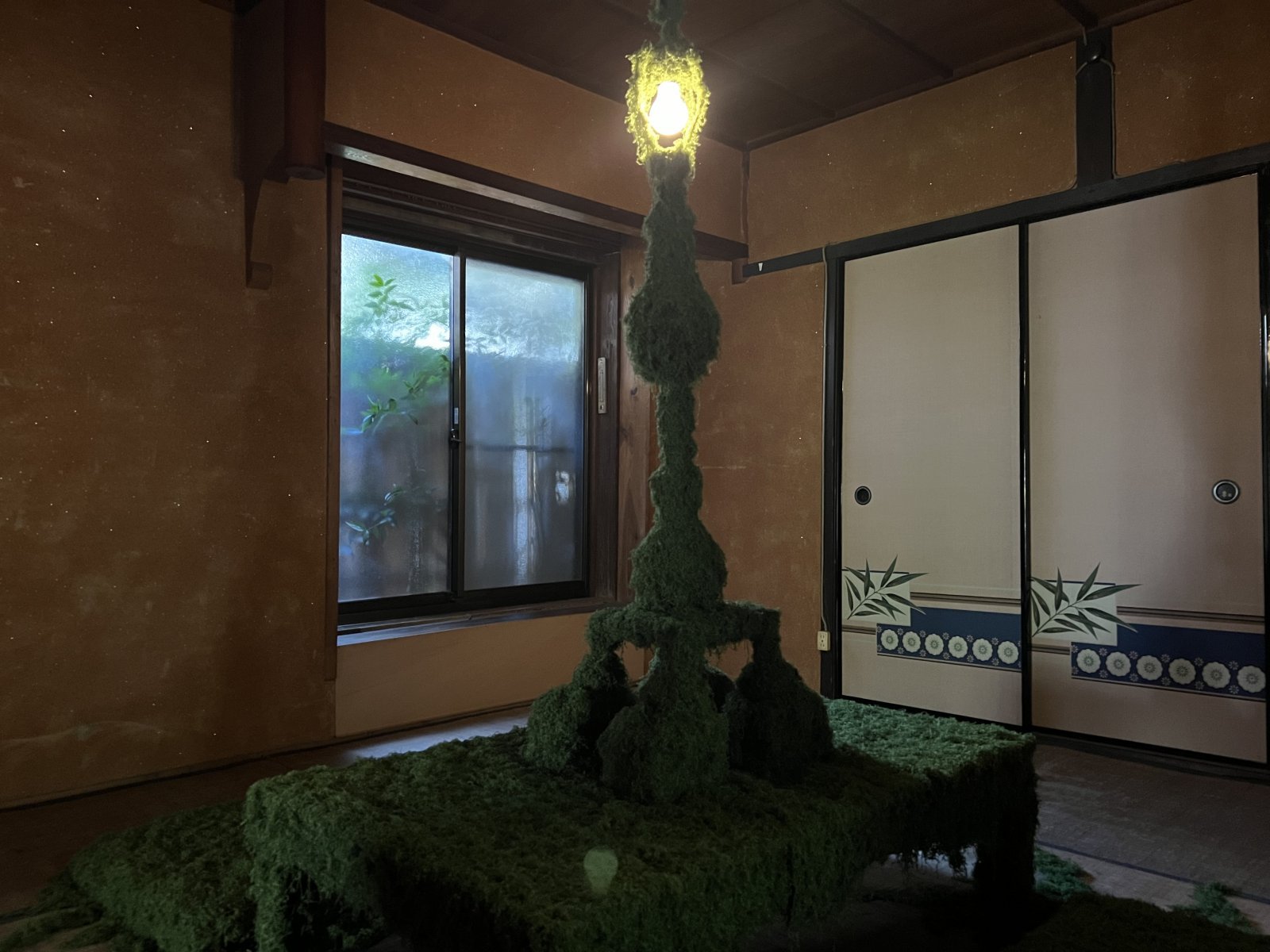 昭和レトロの照明を見て若年期の記憶が蘇ったという、伊藤幸久による少女をかたどった彫刻作品が、和室空間にシュールな光景を生み出している。また暗がりの奥の蔵のスペースにて、水の渦巻くガラス器の作品を手掛けた赤松音呂の『チョウズマキ』から奏でる、かすかなゆらぎのある音にも耳を澄ませたい。