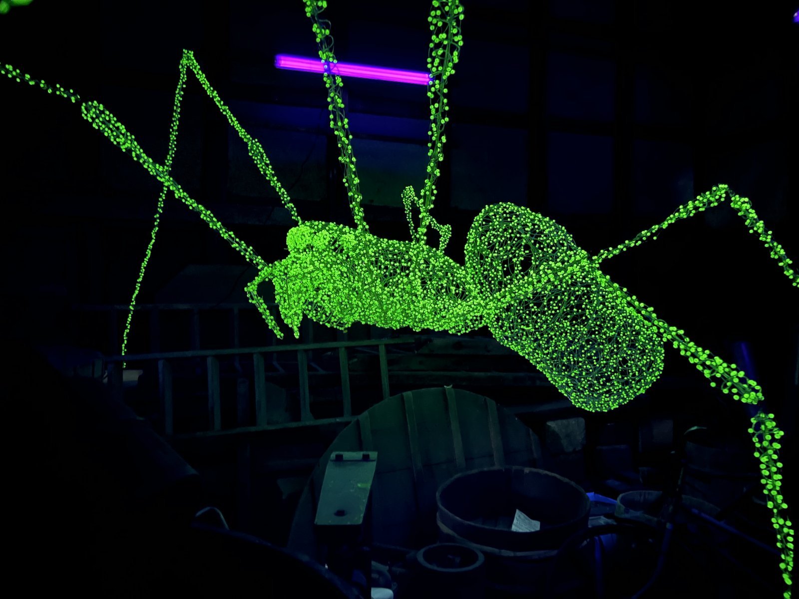 自然物をモチーフとし、ガラスを砕き継ぎ合わせて作品を手掛ける米津真理奈の『Contact』も、素材への深い理解と確かな手仕事を感じさせる。畳を取り外し、床の木材が剥き出しとなった室内には、鳥や植物、それに動物の頭部などをかたどったガラス作品が置かれ、まるで長い時を経た遺物のように息づいている。