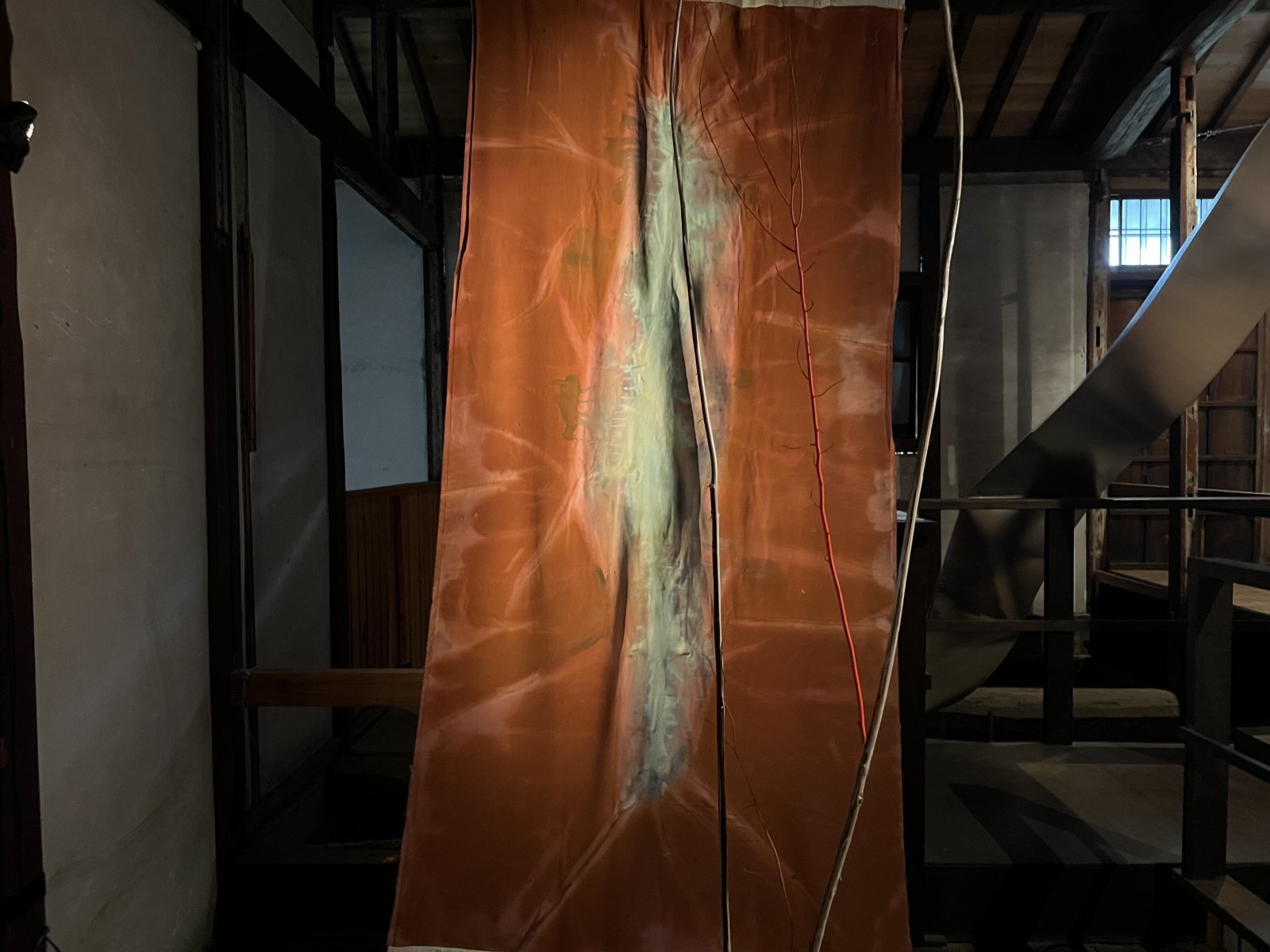 初回の「BIWAKOビエンナーレ」から参加しながら、2023年に急逝した造形美術家のガブリエラ・モラウェッツの『連続体』も見逃せない作品のひとつ。人の姿などさまざまなイメージの写されたアルミ板のロールが空間へと広がり、まるで巨大化したネガフィルムの中をさまようかのような体験が得られる。また同じ空間では、ガブリエラの娘であるパオラ・ニウスカ・キリシによる、綿に染料を施した作品も目にすることができる。