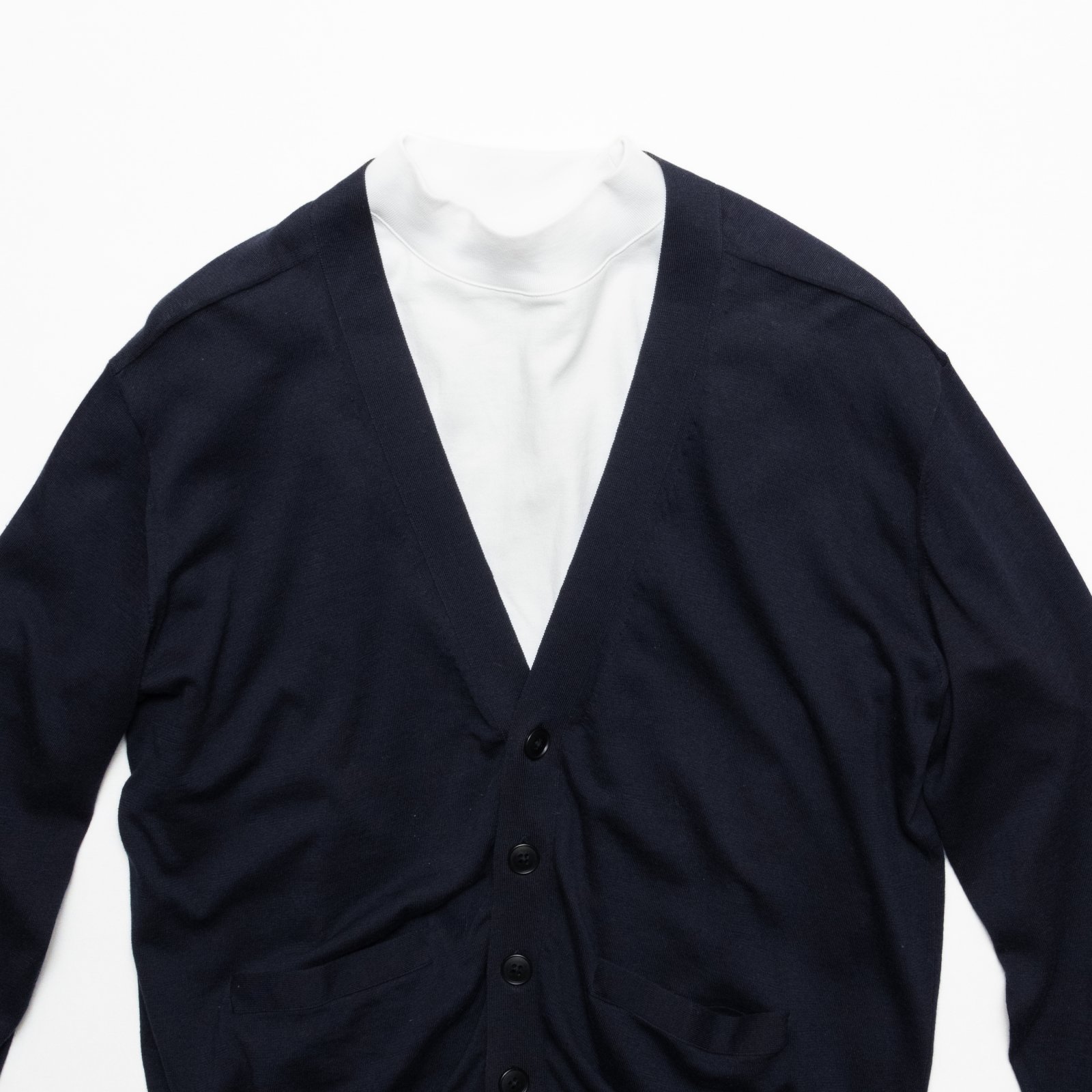 セーターもわずかな工夫で小顔効果を獲得できる。お薦めは近年人気が出てきたVネックニット。顔、首、胸と目線が自然に下に流れて、見る人の目線を顔に集中させず散らすことができる。カーディガンでも同じ視覚効果を演出できる。ニットのインナーをメリハリのつく色にしてVゾーンを強調するとより有効だ。例えば黒ニットならインナーを白やグレーに、ベージュニットならイエローやオレンジに。インナーを襟付きシャツにすると、首周りにボリュームが出て顔とのバランスを整えやすくなる。Tシャツならヘンリーネックや襟が太いモックネックが候補になる。