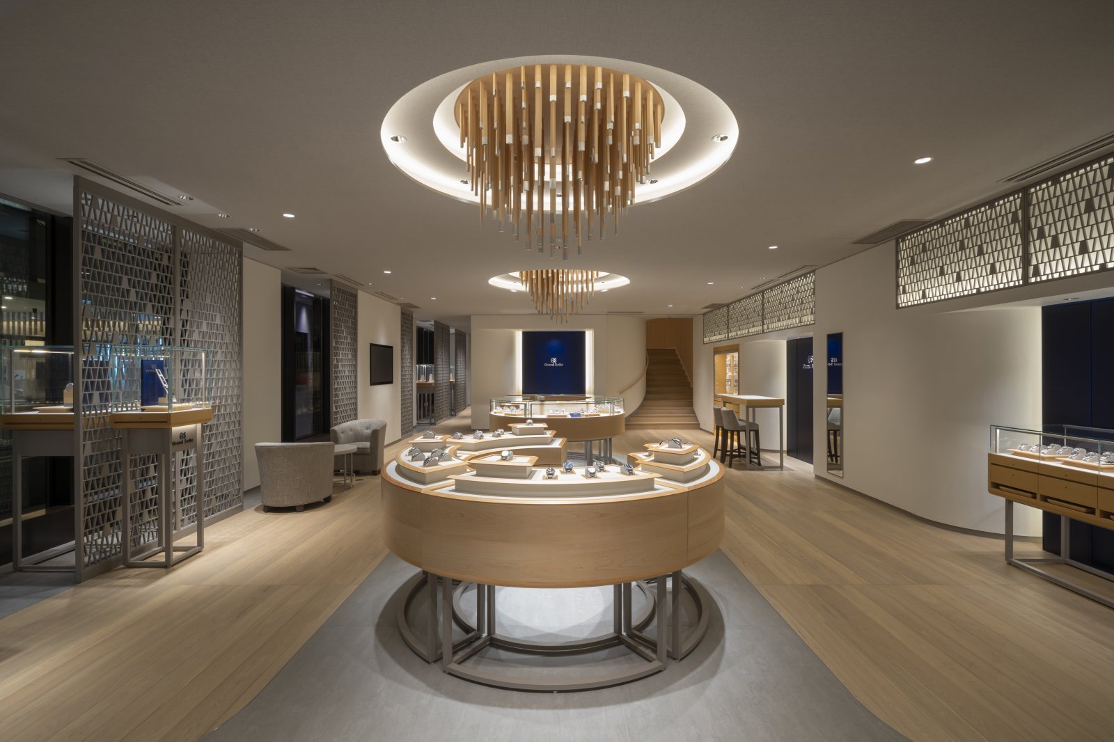 また、やわらかな曲線を描く漆喰調の壁と白木を基調に、木目調の天井装飾や、グランドセイコーのインデックスをモチーフとするアイコニックなパネルも配置。空間にはグランドセイコーブティックのために調合されたウッディなアロマも漂い、凛とした中にも心地よい空気感が醸成されている。