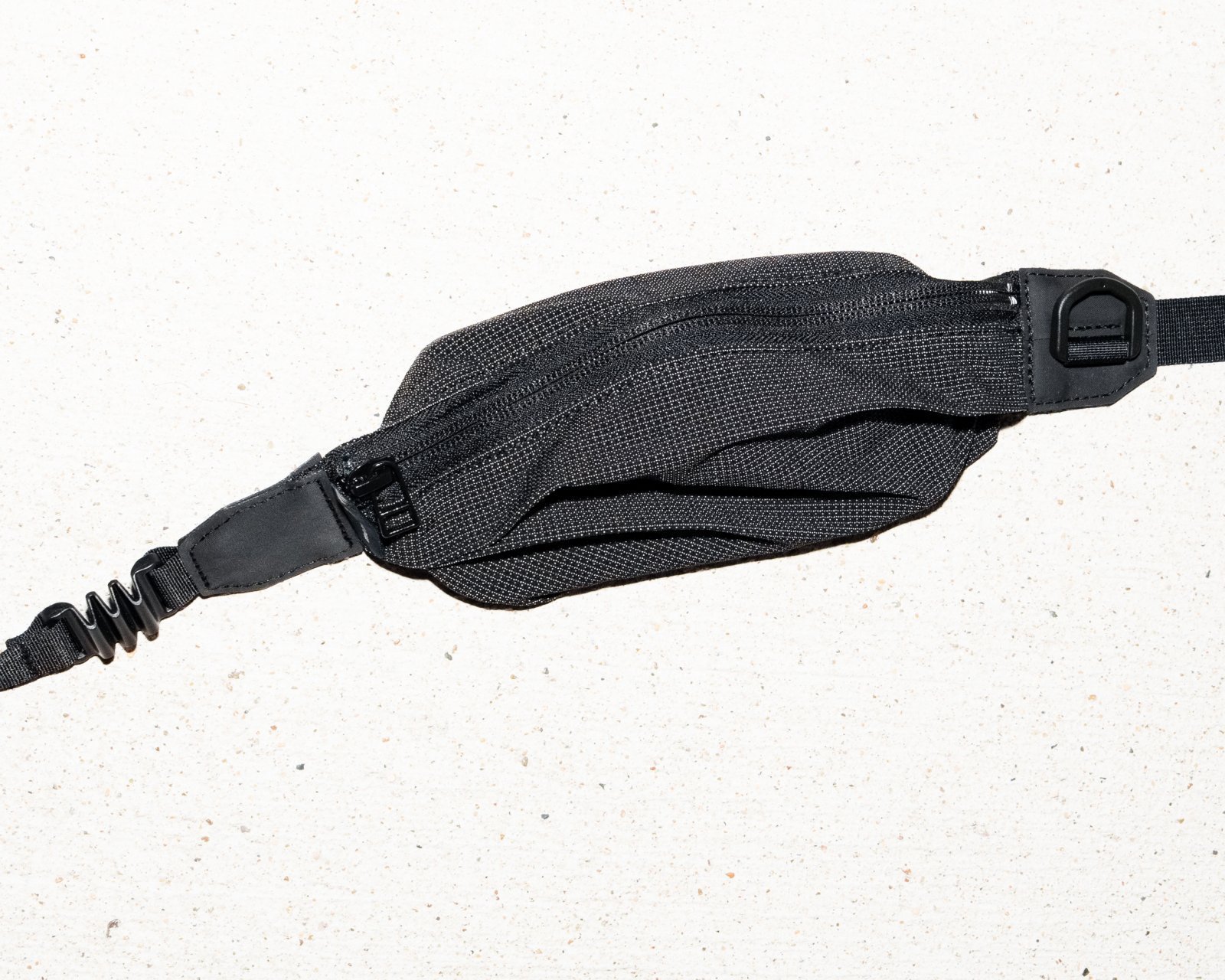 近所を走るときミニボトルを入れ斜めがけして、軽快なランニングポーチに。