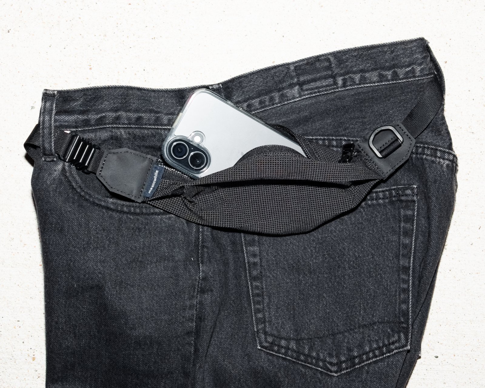 ふだんはベルトとして使い、昼のランチで外出するときスマホを差し込んで持ち歩いたりオフィスワーカーにも便利。