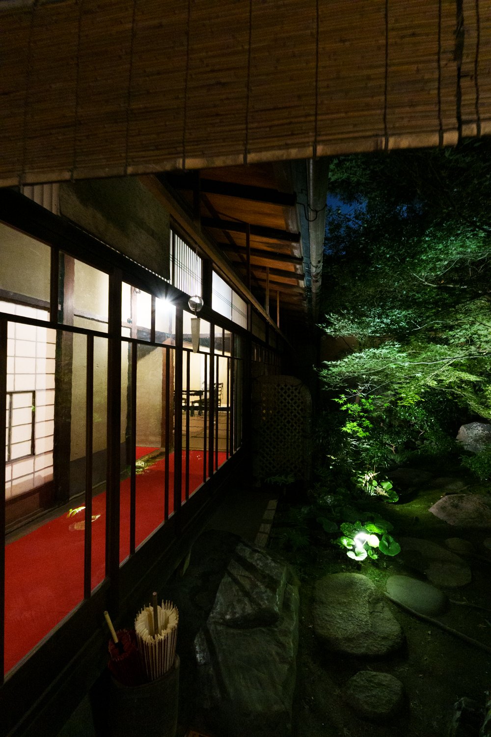 夜のガラス越しに見る庭は風情が感じられる程度で、細部までは判別できません。