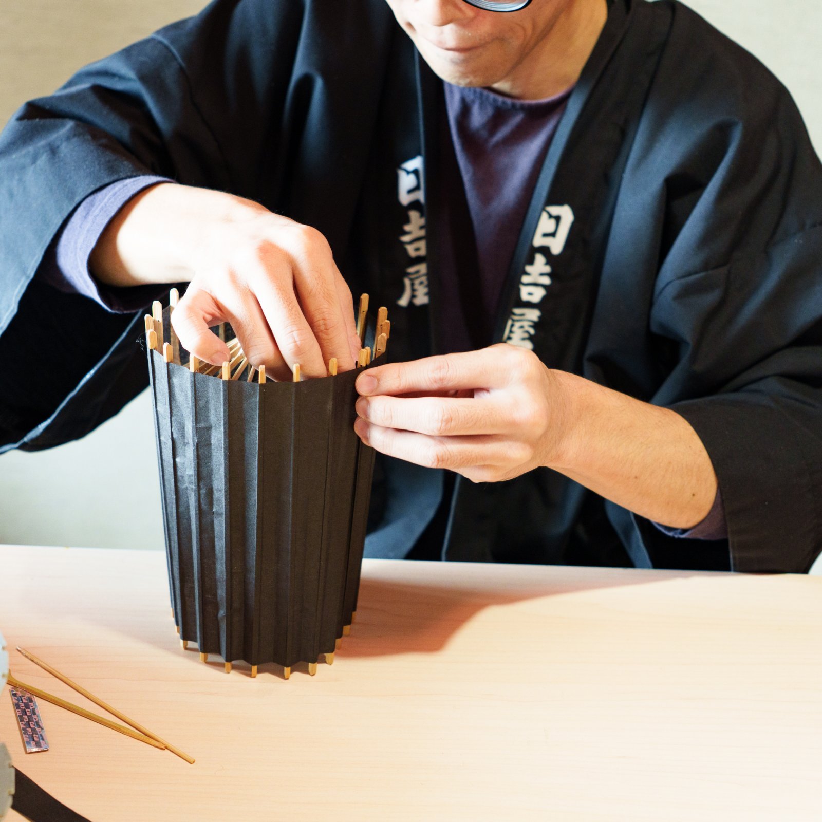 きゅっと束ねて広げることを繰り返す和傘の制作は、筒状の竹を正しい順番で組み上げる必要があるそう。