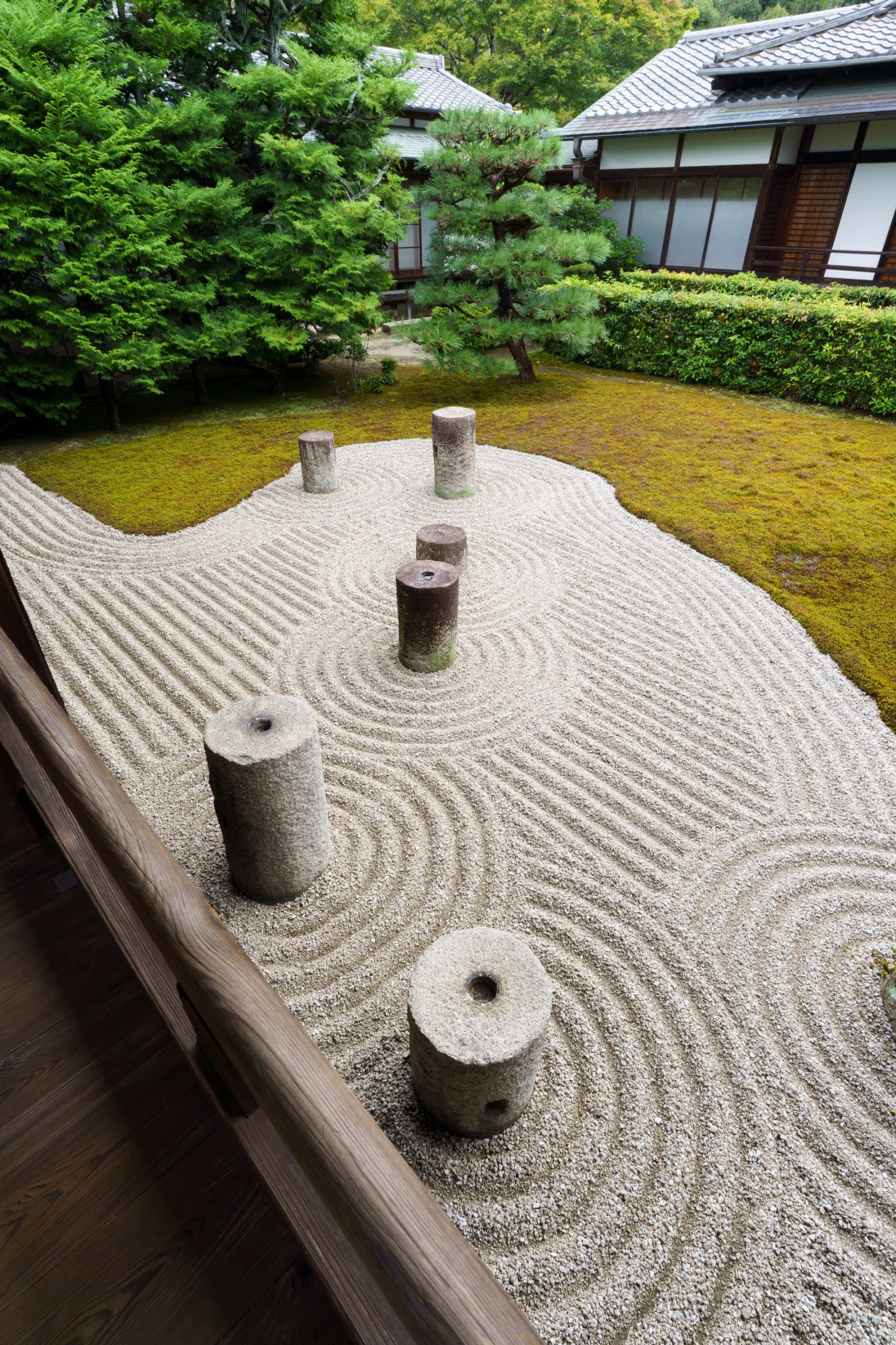 砂を海に見立てた枯山水のモダンな表現。