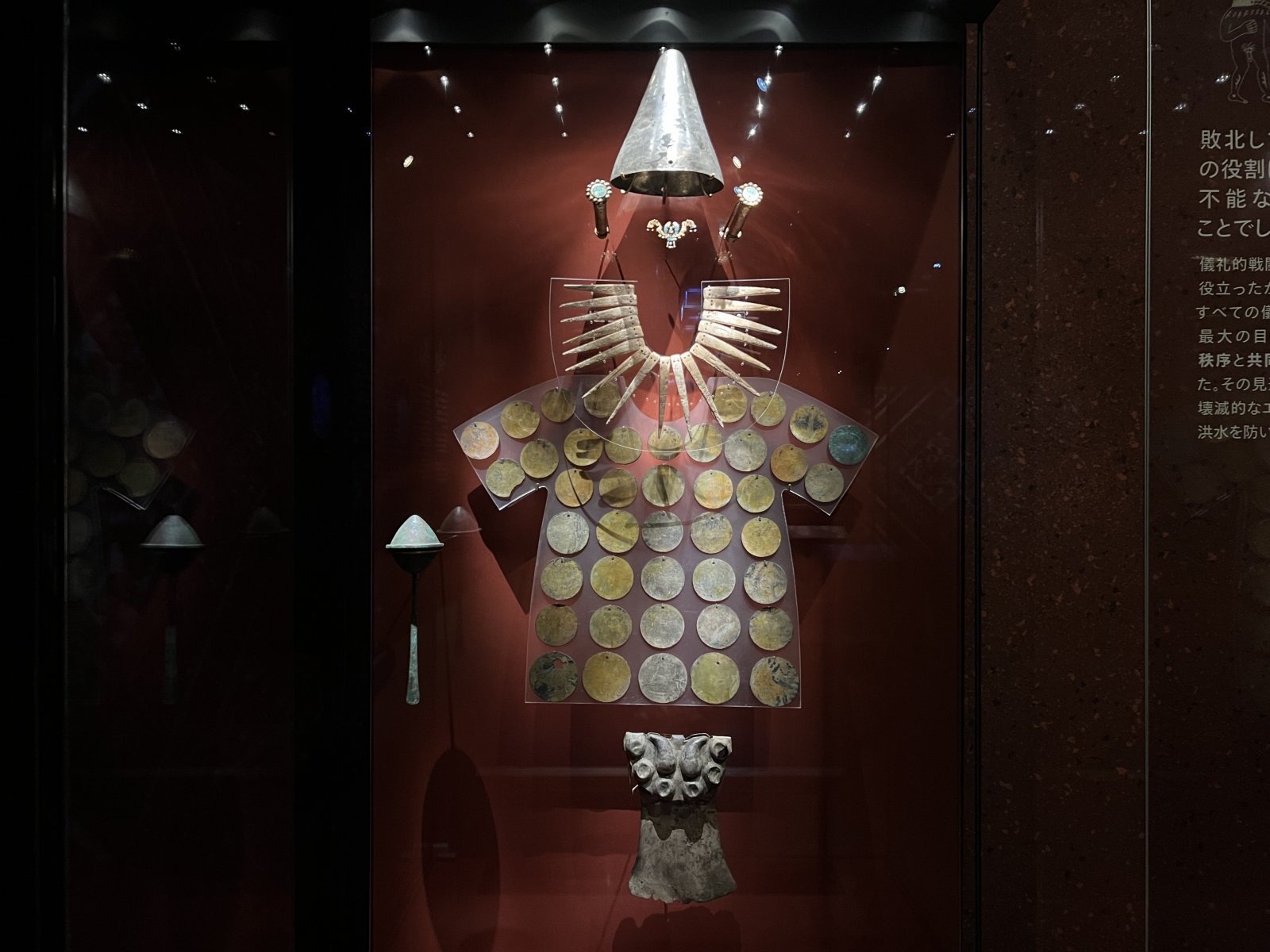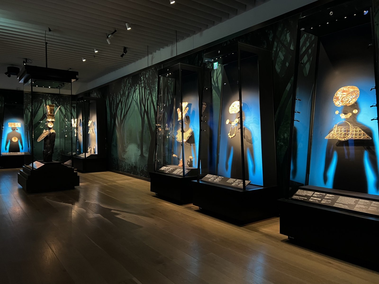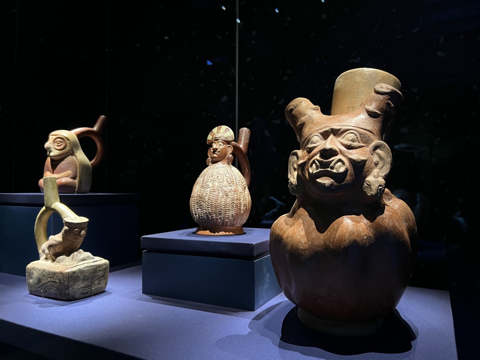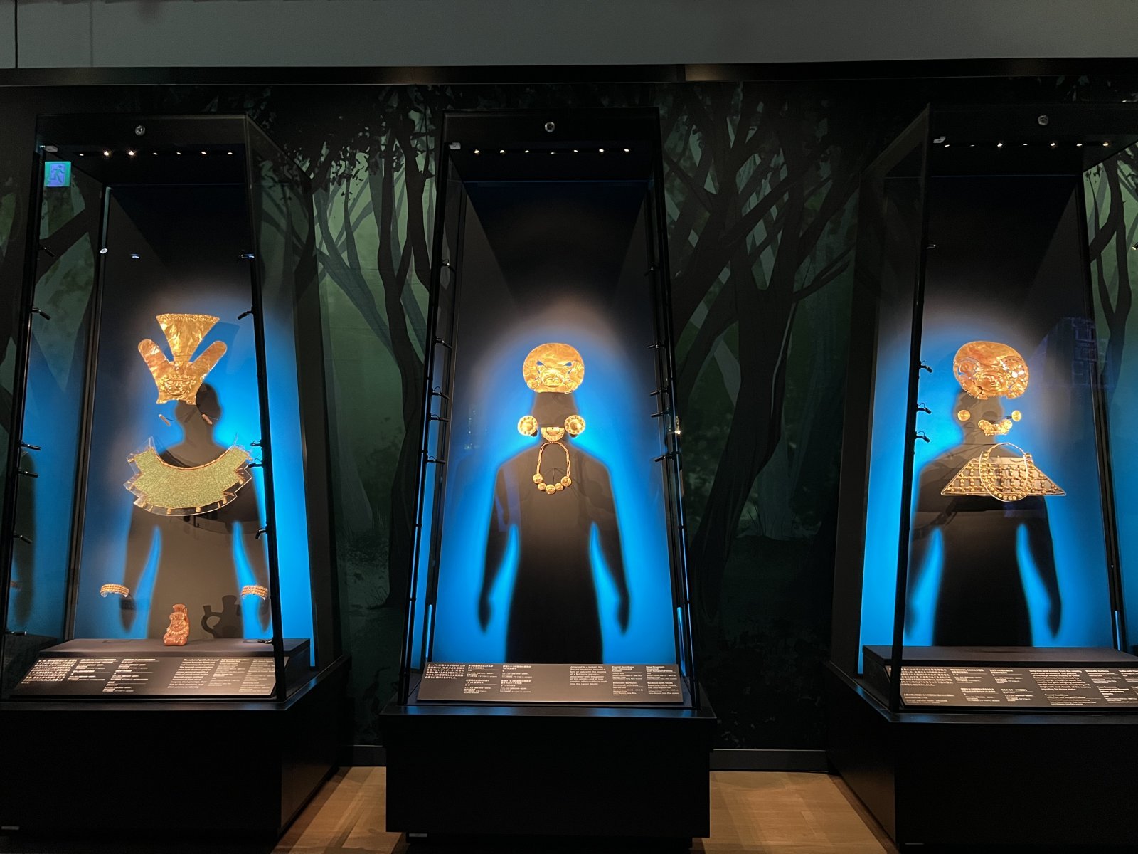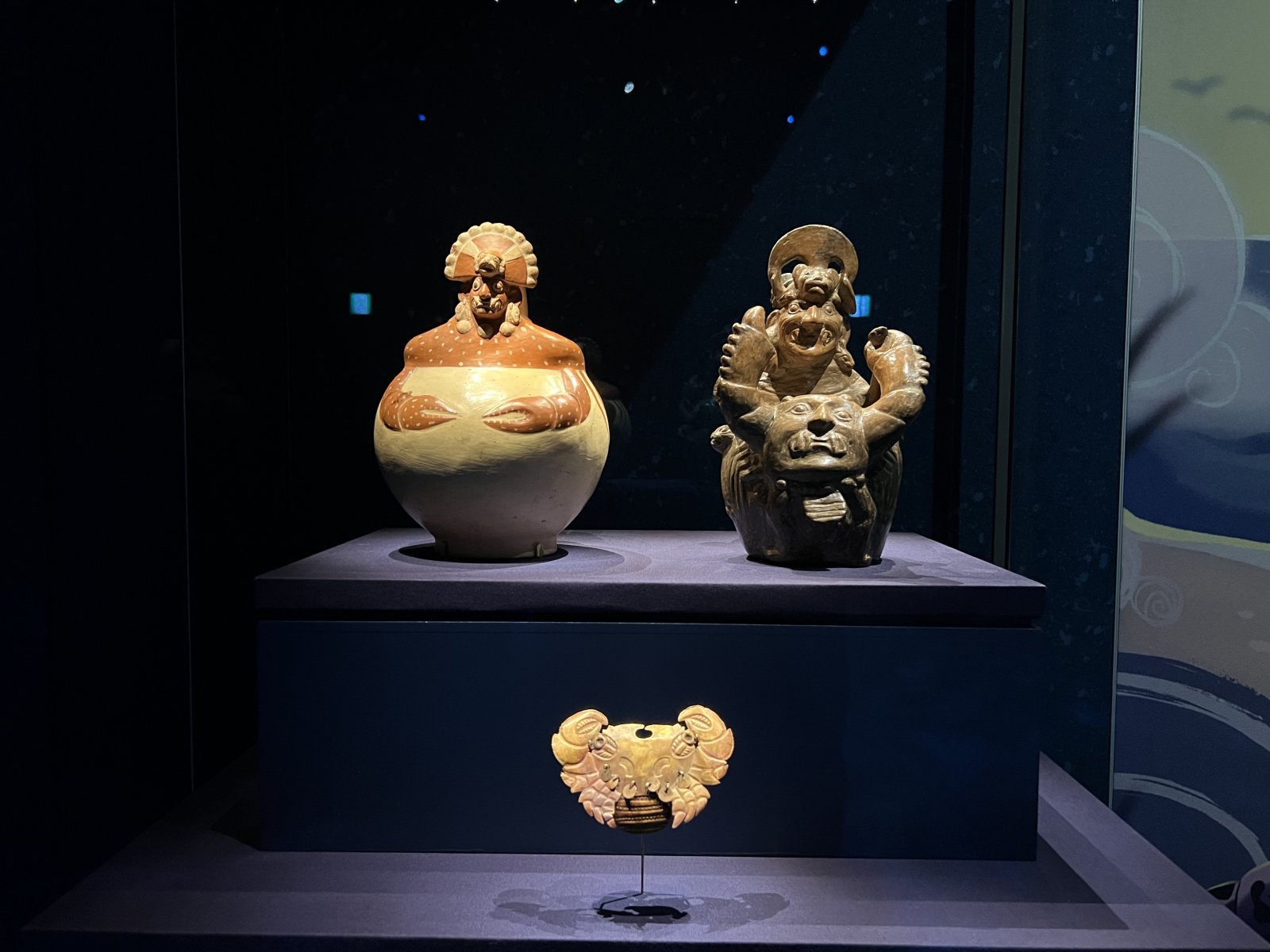 アンデスの支配者が実際に身につけていた装飾を、そのままの姿で間近に見られる展示も充実している。ここではモチェと継承者であるチムー王国の9人の支配者たちが、死後に神へと昇華される存在としてどのように葬られていたかを、金や銀で彩られた精美な副葬品とともに紹介している。鳥の形をした羽根飾り付きの冠やペリカンをモチーフにした耳飾り、カエルの象った首飾りなど、多彩で精緻な意匠からは、アンデスの卓越した金工技術と美意識を感じることができる。