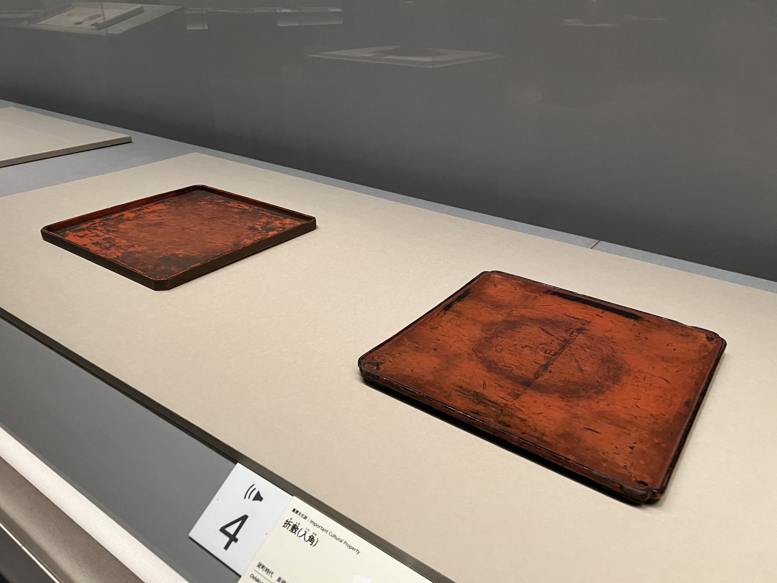 『二月堂練行衆盤』とは、東大寺の修二会(しゅにえ)、いわゆるお水取りに参加した僧侶のためのお盆。僧侶は二月堂の下の食堂(じきどう)で正午に一日一回の食事をとるが、その最後に食器類を載せて片付けるのに使われた。展示品は鎌倉時代の作で、長い間使われたことから、盤の中央あたりの朱漆が擦れ、黒漆が露出していることが見て取れる。この風合いを近代の数奇者たちは愛おしみ、丸い形を日の丸に見立て、「日の丸盆」として珍重した。---fadeinPager---
