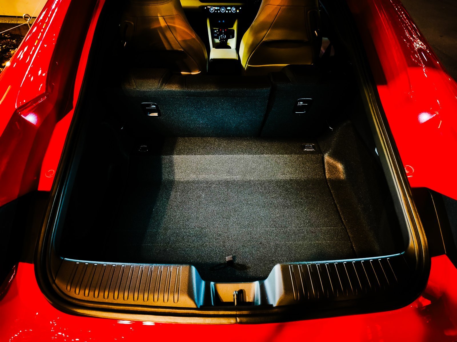 ハッチバックの充分なトランク容量。後席を倒せばゴルフバックが2つ収納できる。