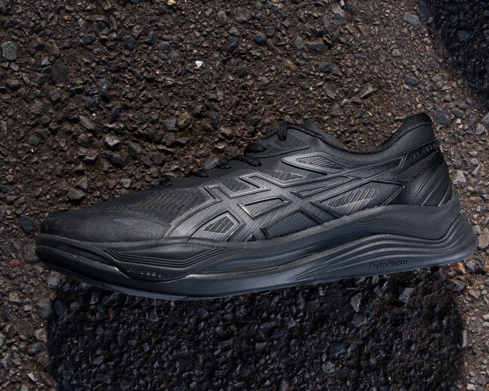 見た目はシンプルながら、世界のランニング市場で名を馳せるアシックスの技術が盛り込まれている。歩いてみると競技用ランシューに似た前に転がるような足運びを感じる。クッション力も同様のクオリティだが、長時間歩行に向く安定したグリップ感もある。ランニング用ソール「GUIDESOLE」の前足部に「面領域」と呼ばれるパーツを取り付け、転がりすぎるのを防止した工夫などによるものだ。