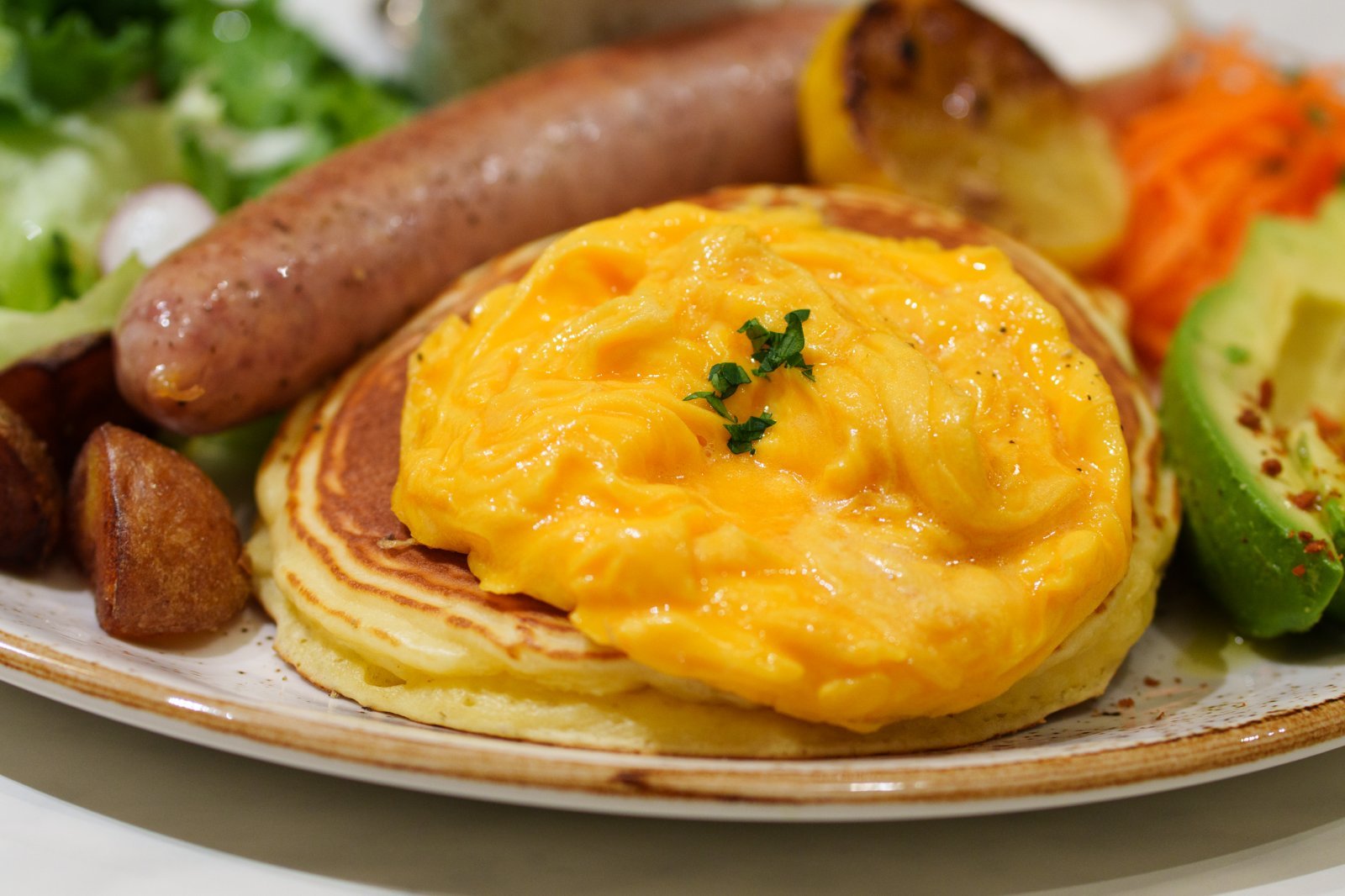 せっかくのパンケーキですから「アメリカのダイナーみたいに甘いメープルシロップで行くか」と考え、スクランブルエッグの上から掛けてみたら……激ウマでした!