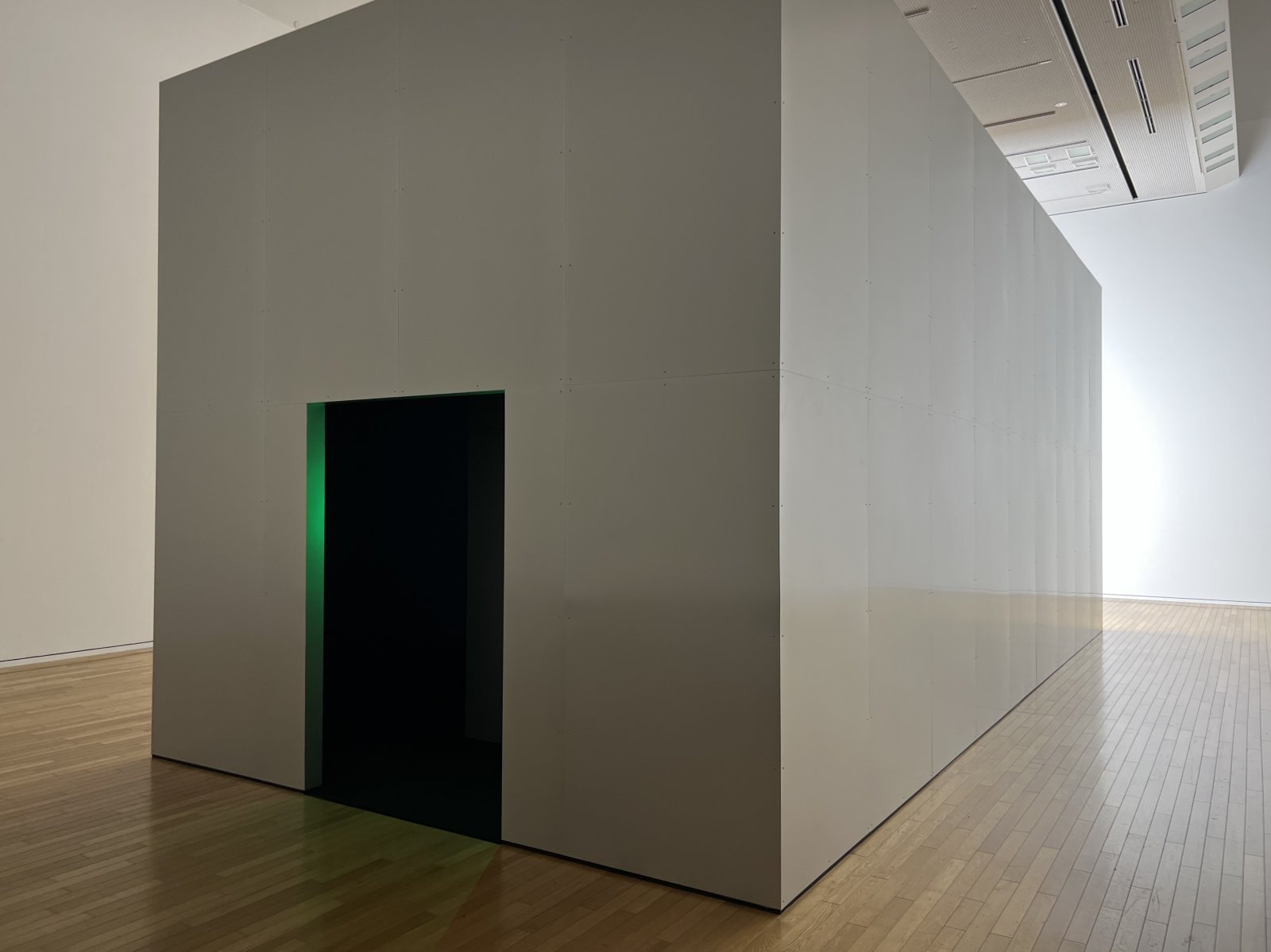 『サウンド・オブ・サイレンス』は、8分間の映像によって一枚の報道写真をめぐる物語を紡ぐ、シアター型のインスタレーションだ。約250立方メートルの巨大な構造体の内部は、赤と緑のランプで入場が制御され、上映が始まると中に入ることはできない。作品では、南アフリカの報道写真家ケヴィン・カーターと、彼が撮影した写真「ハゲワシと少女」にまつわる物語が、静かなテキストのモノローグを中心に展開される。(後に被写体は少女ではなく少年と判明。)