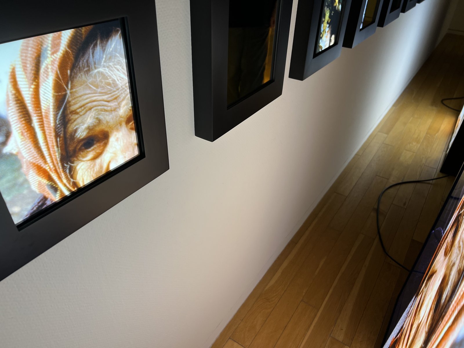 6面のライトボックスと30枚のミラーによって構成された『エウロパ』にも注目したい。全面にオレンジ色の輝きを放つのは、1990年代初頭のボスニア紛争によって都市を覆った炎のイメージ。中を覗き込むと、狭い空間に押し込められた移民や戦火に焼かれた風景の断片などがライトボックスの背面に映される。ジャーは「その光景は、今日のロシアによるウクライナ侵攻とも重なる」と語り、過去と現在をつなぐ痛みの連続を示唆している。---fadeinPager---