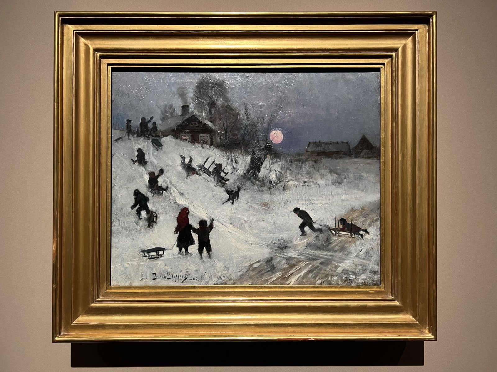 「まず、ブリューノ・リリエフォッシュの『そり遊び』に目を奪われました。スウェーデンの冬は午後3時にはもう暗くなりますが、学校帰りの子どもたちが集まって雪遊びをしている情景が浮かびます。顔の表情を描かずとも、その楽しさが伝わってくるのが良いですね。まさに『日常のかがやき』というテーマを象徴する作品です」