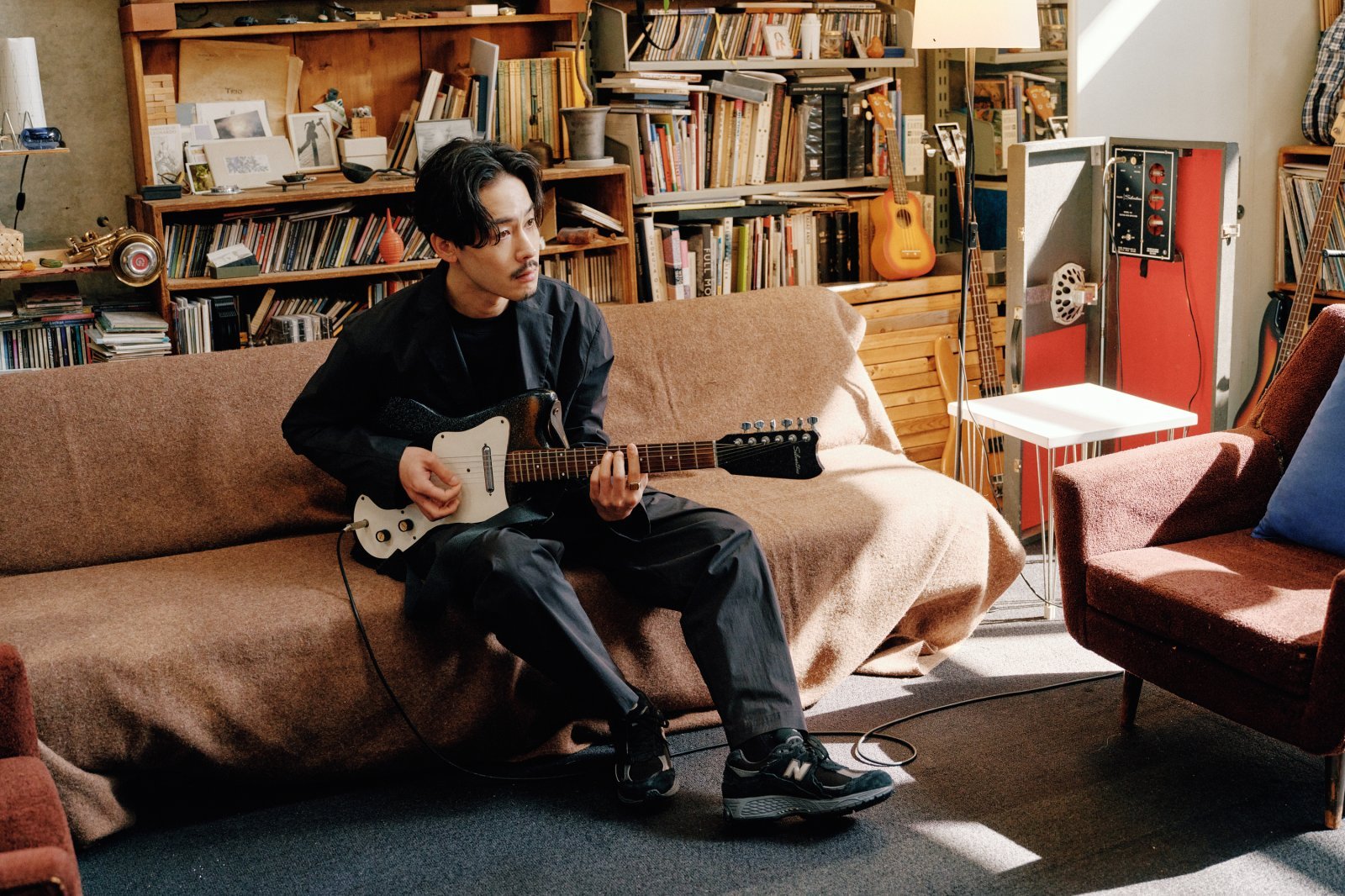 制作の現場は、長い集中力を求められる場所だ。大型ミキサーに向かい、モニターを確認しながら音を積み上げていく作業は、時に何時間にも及ぶ。そんなスタジオでTENDREが纏うのが「NB GREY シングルジャケット」と「NB GREY ワイドパンツ」のセットアップだ。
