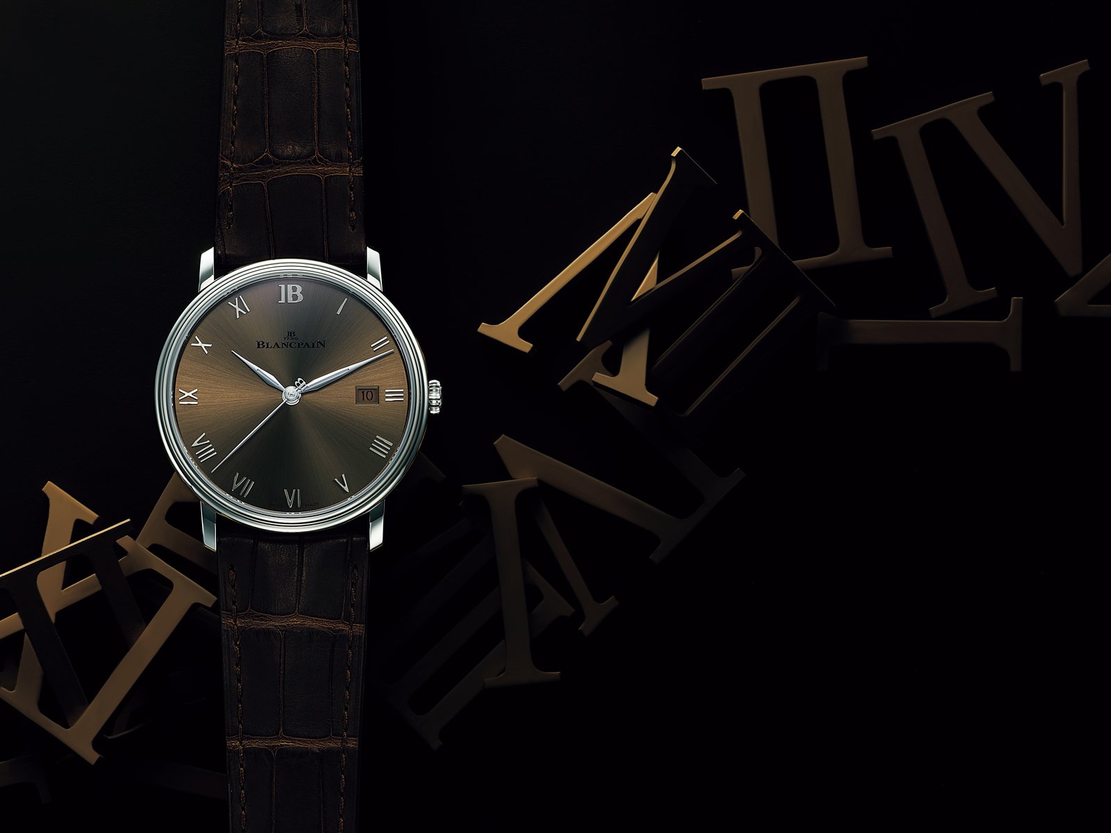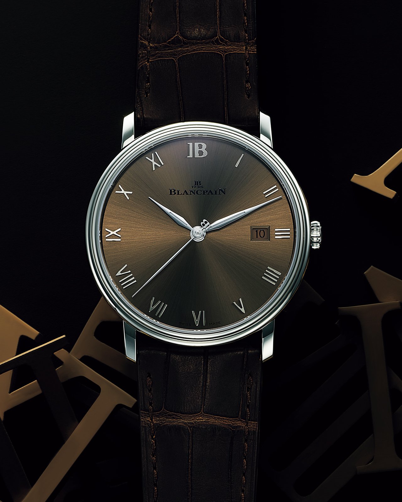 古典派の頂点に立つブランパンの「ヴィルレ」が、ブラウンゴールドのダイヤルカラーを纏うことで、驚くほど艶やかな色気を獲得した。二重の段差を設けたダブルステップ・ベゼルと、繊細に造形されたゴールド製ローマンインデックス。そこに重なるチョコレートのような文字盤の色彩は、伝統を単なる歴史の継承にとどめず現代の装いへと引き寄せる進化の象徴だ。