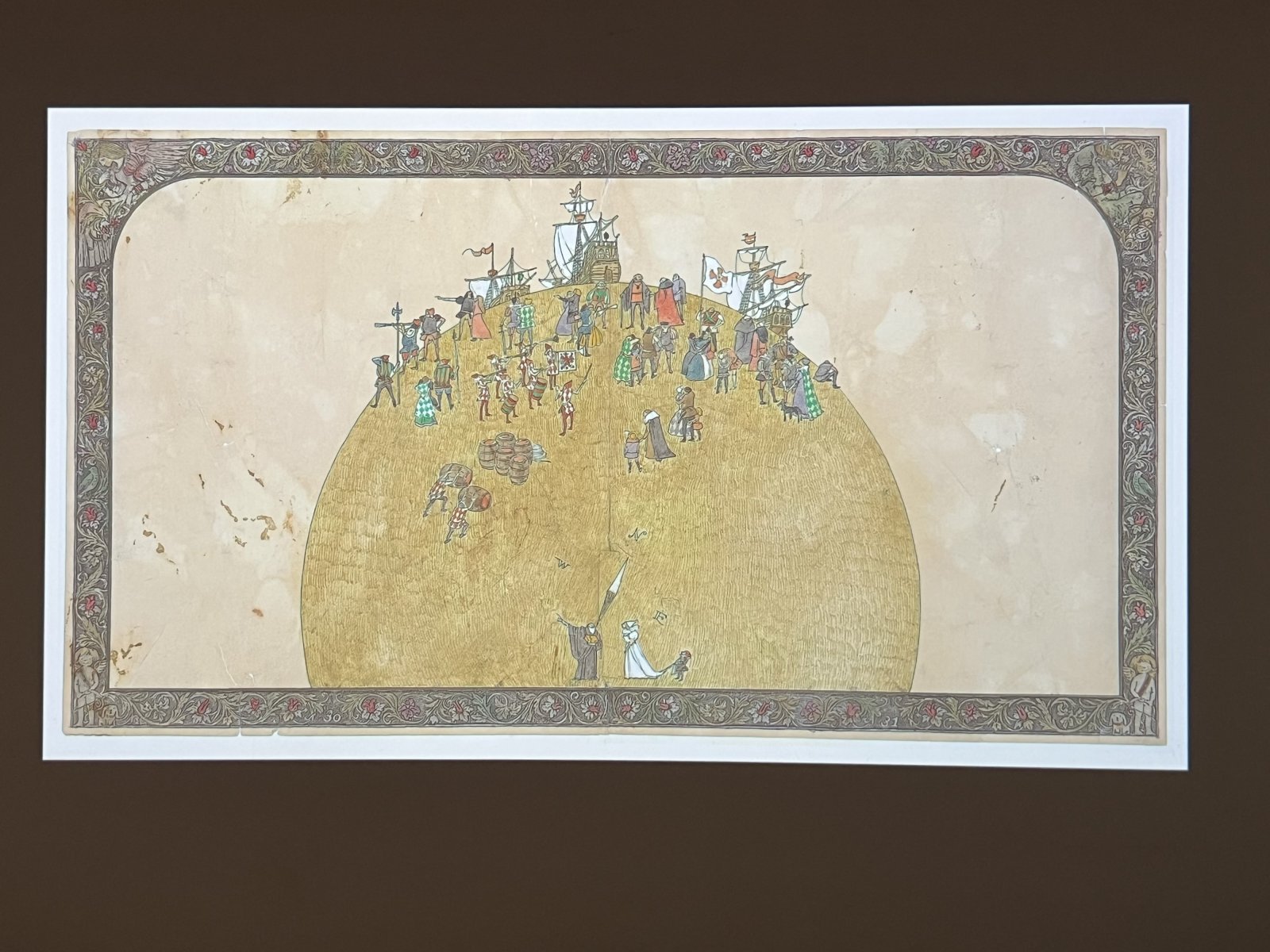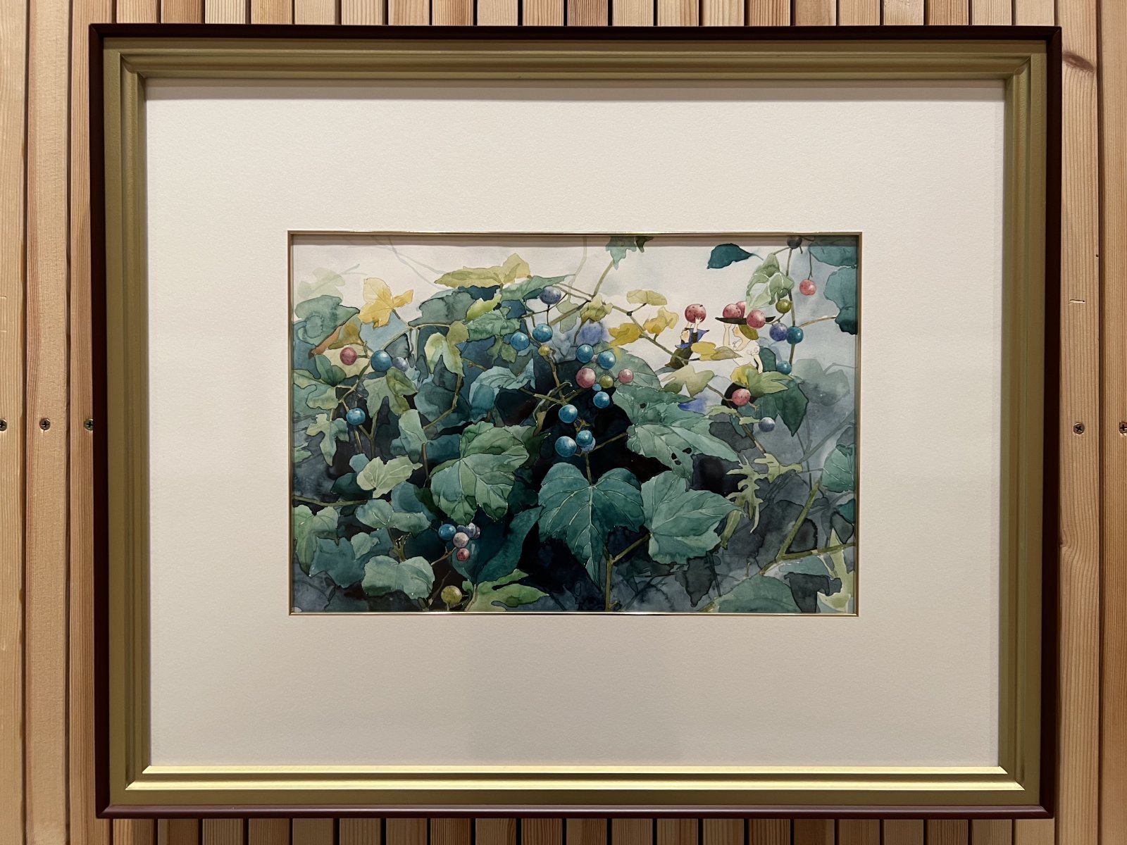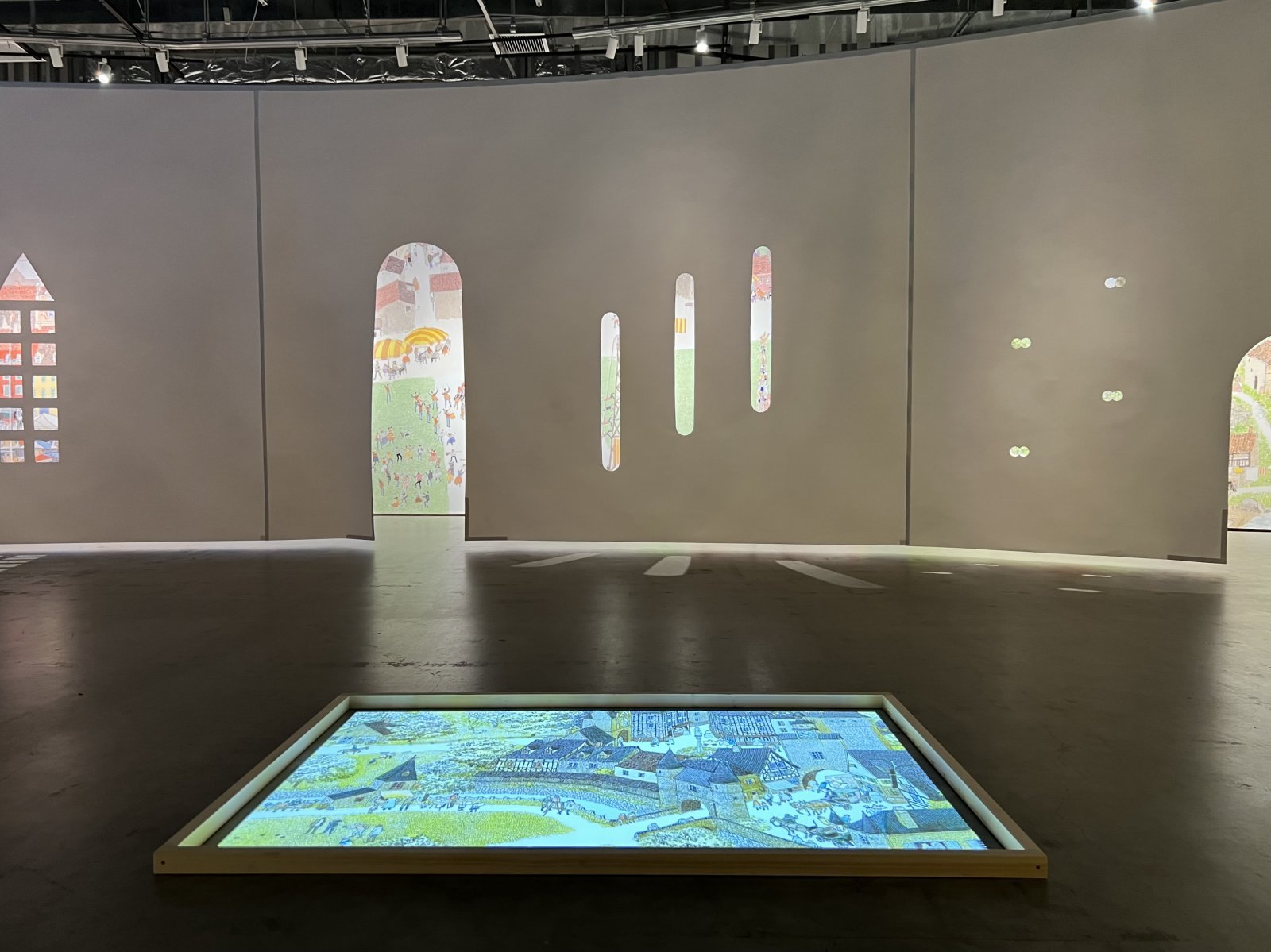 代表作『旅の絵本』の「イギリス編」の原画全点をたどりながら進むと、やがて旅の風景へと入り込むような楕円形の大空間に導かれる。ここでは『旅の絵本』や『野の花と小人たち』から選ばれた8つの場面を壁いっぱいに広げた複製プリントを展示。さらに足元の床には絵本の場面を拡大し、アニメーションとして再構成した映像も設置され、来場者は絵本の世界を歩くような感覚を味わえる。