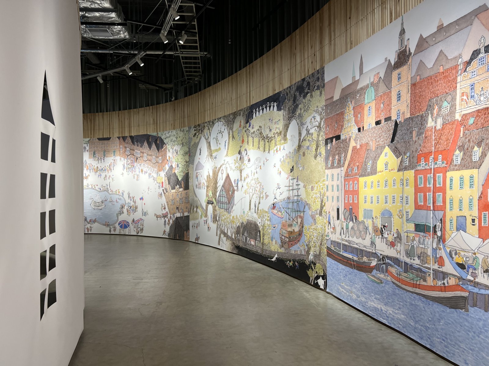 ima(小林恭+マナ)による会場デザインに目を向けたい。壁面の巨大なプリントの前にはいくつもの窓が設けられているが、これは安野光雅がヨーロッパを旅した際、着陸間際の飛行機の窓から見下ろした風景が『旅の絵本』誕生のきっかけとなったことにちなむもの。来場者は窓越しに作品をのぞき込みながら、安野と同じ視点で大地を眺めるような体験を得られる。