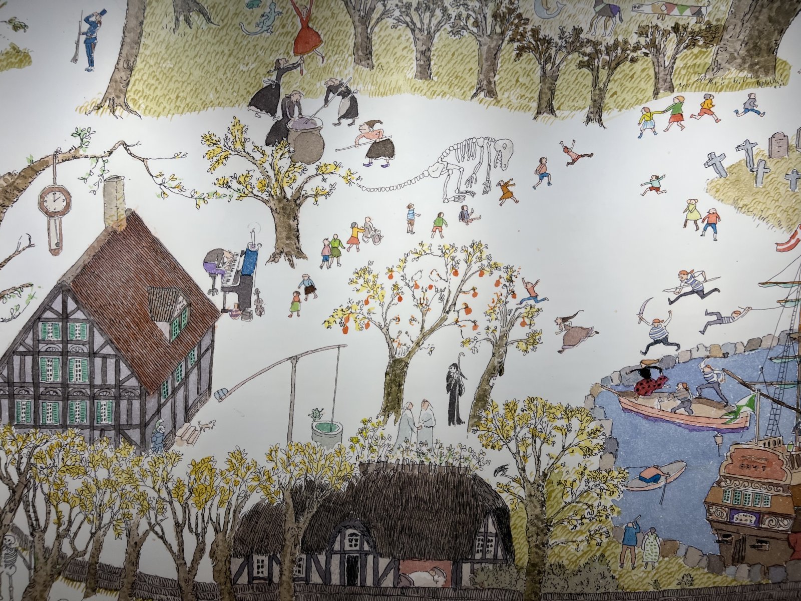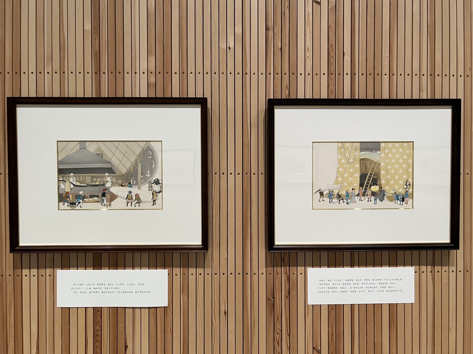 安野が描いた普遍的なテーマを、独自の視点で再構成した「絵画館」も見逃せない。平家物語やシェイクスピアを題材とした歴史画や、世界各地を旅して描いた風景画を、絵本や物語の文脈から取り出して「一枚絵」として掲げている。安野自身も絵本のための絵について、「一枚一枚で壁にかけておく」ものとして描いたという言葉を残しているが、ページをめくる体験とは異なり、絵画としての輝きを放つ作品と静かに向き合える。