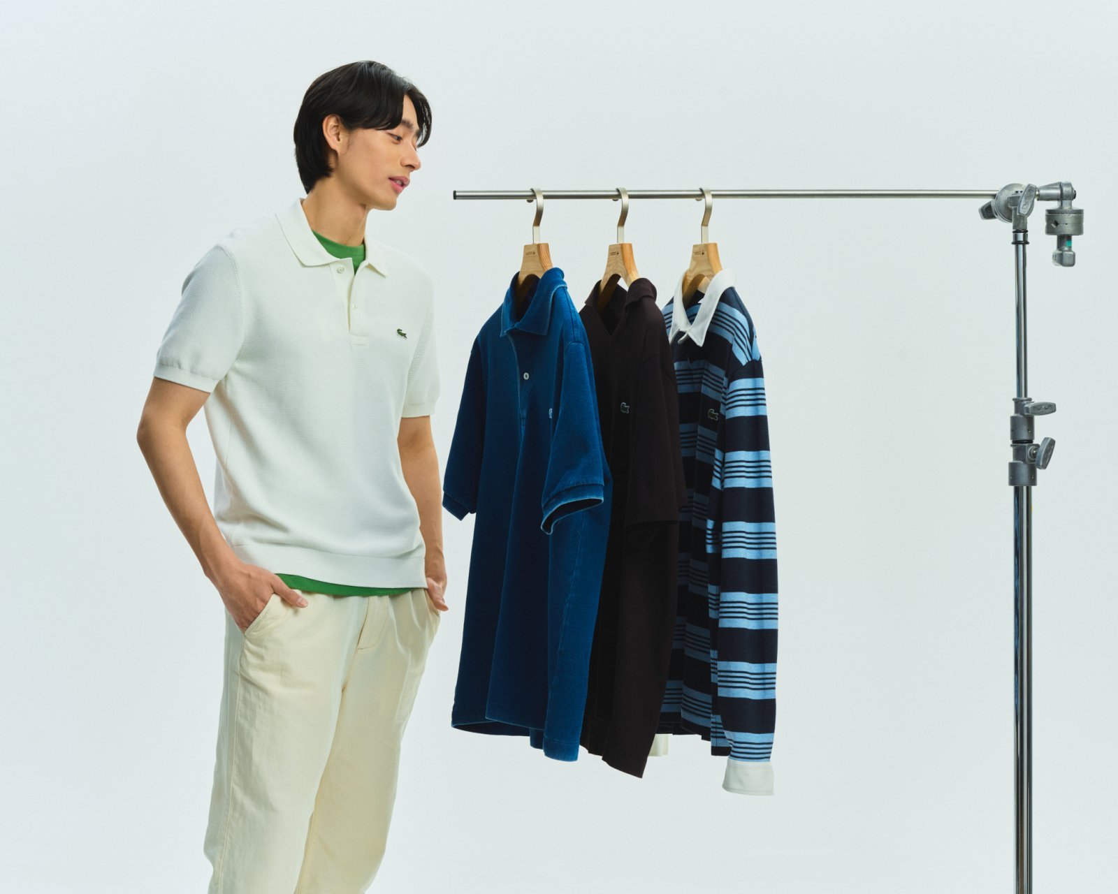 ラコステのポロシャツと聞けば、多くの人が思い浮かべるのは鹿の子素材の定番モデルだろう。だが現在のラインアップを見渡すと、その表情は想像以上に豊かだ。ハイゲージニット、スキッパーネック、インディゴ染め、ラグビー由来のボーダー。クラシックなポロという枠組みを守りながら、素材やディテールを変えることで、多彩な表情が生まれている。そんなラコステのポロシャツの魅力を、俳優・濱尾ノリタカが4つのスタイルで体現する。