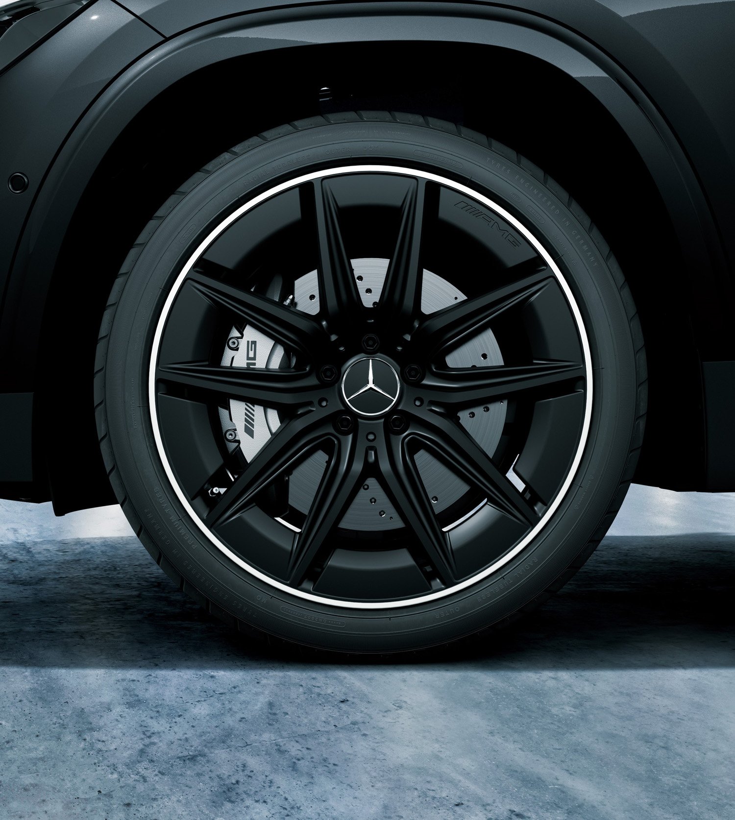 エクステリアは外装色コスモスブラックに、通常モデルには設定のない「AMGナイトパッケージ」「AMGエクステリアナイトパッケージII」を採用。フロントグリル、サイド/リアバッジ、フロントスプリッター、ルーフレール、エグゾーストテールパイプトリムなど、細部までハイグロスブラックまたはブラッククロームのアクセントを施し、ブラック仕上げの20インチAMGアルミホイール採用によって、より精悍で統一感のあるデザインに仕上がっている。
