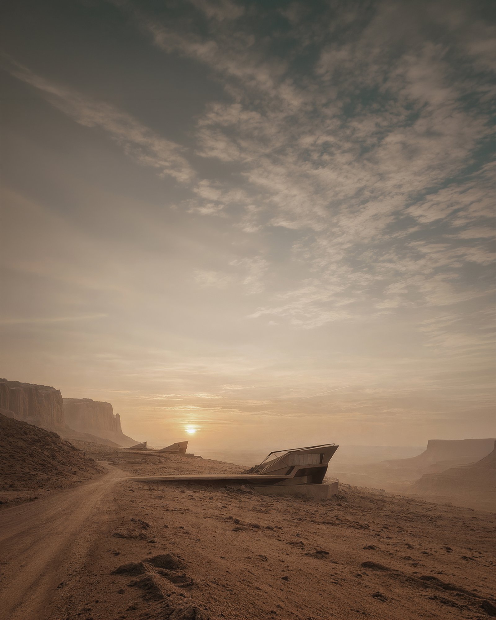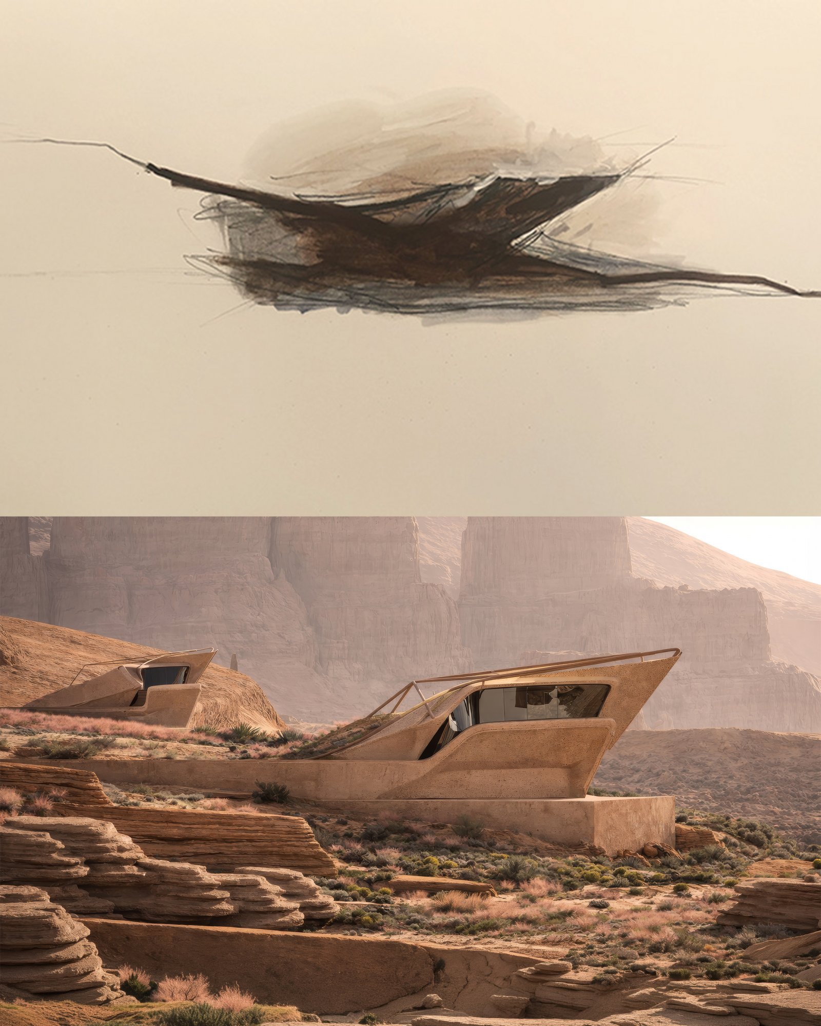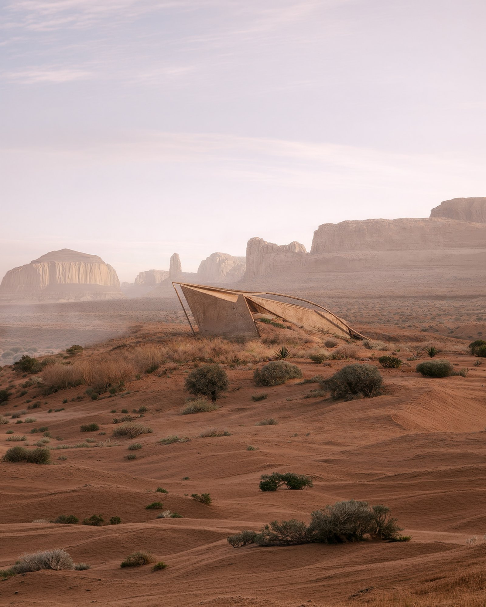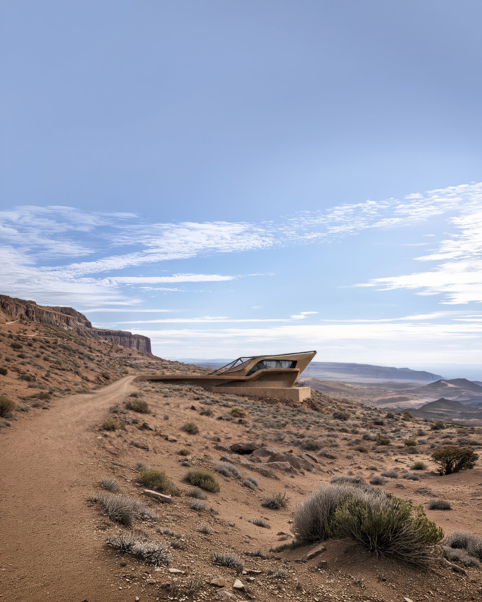 砂漠の地平に、地層がそのまま押し出されたかのような建築が横たわる。アメリカ・ユタ州の荒野を舞台に提示されたこの印象的なビジュアルは、映画「DUNE/デューン 砂の惑星」の世界観を彷彿とさせる。