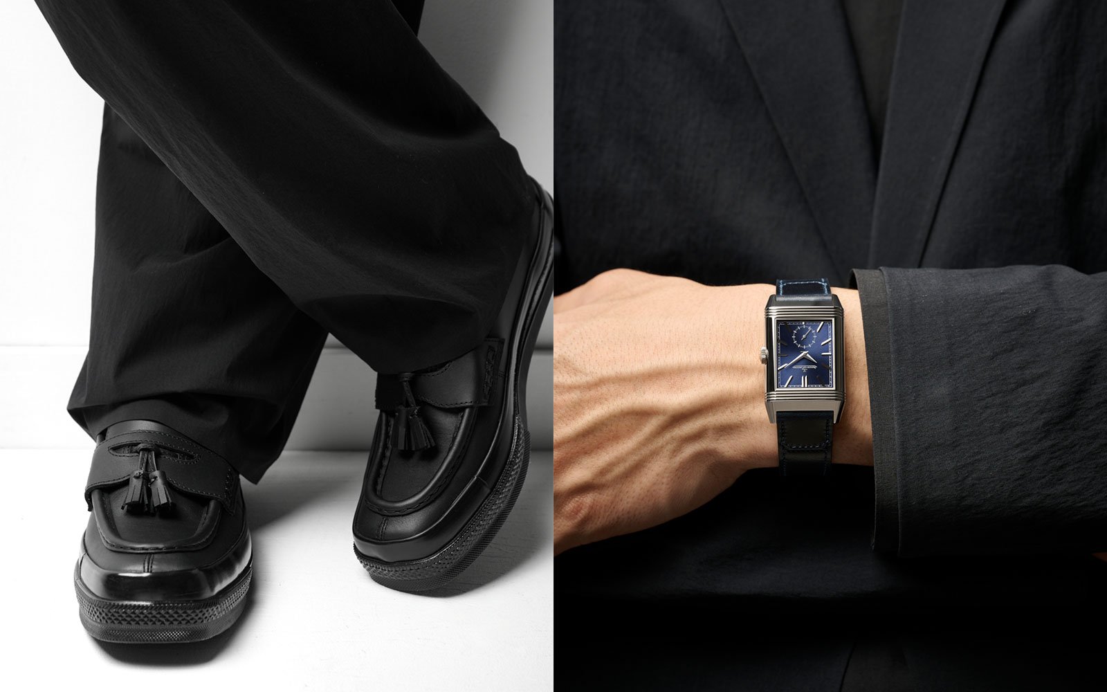 スタイルの要となる“靴”と“腕時計”——。両者のベストなマッチングを考える。今回は、出自はスポーツでありながらドレスの品格を備え、さらにシーンに合わせて表情を変える「2WAY仕様」という共通点を持つ、コンバースとジャガー・ルクルトの名品を合わせる。