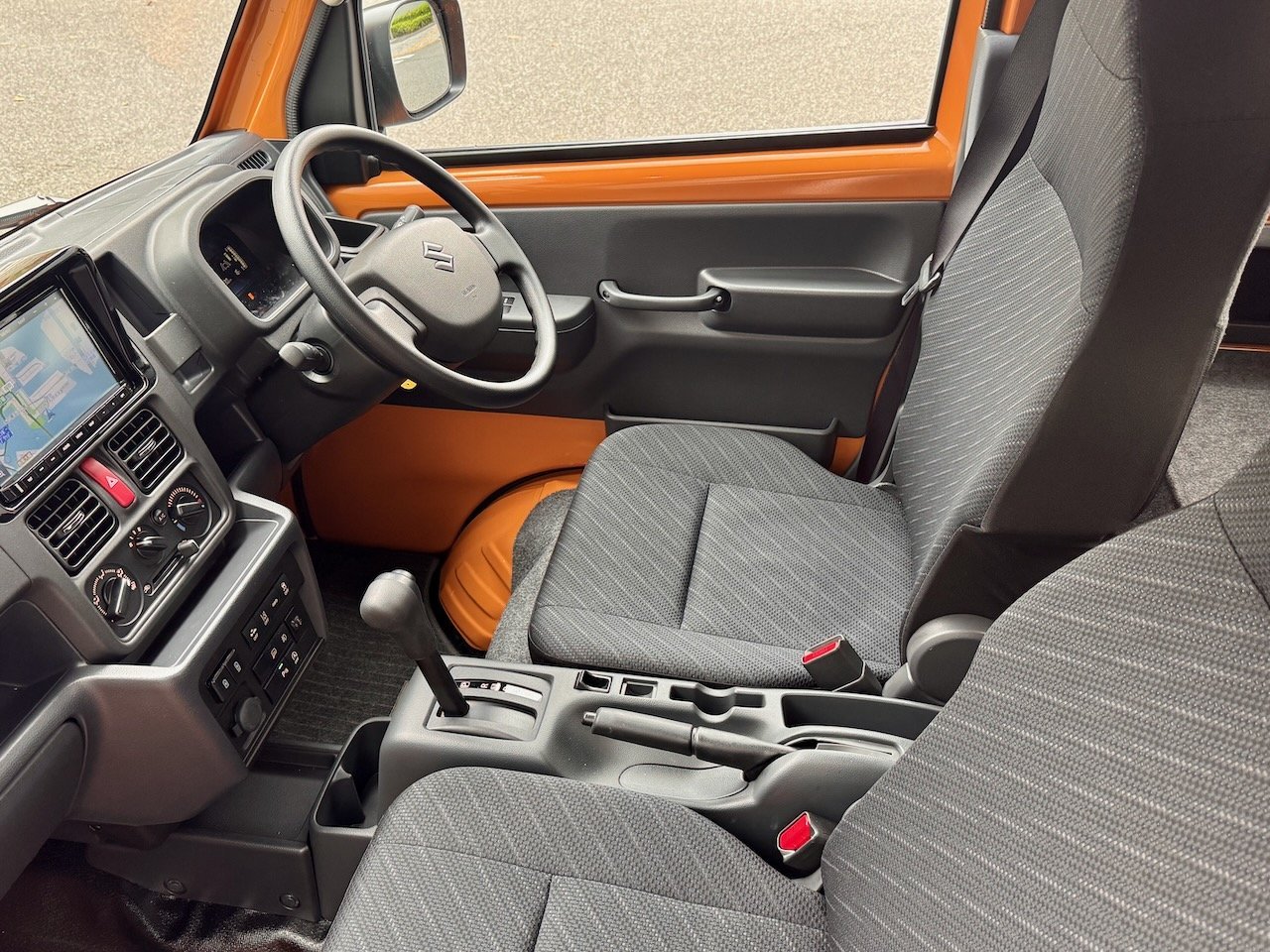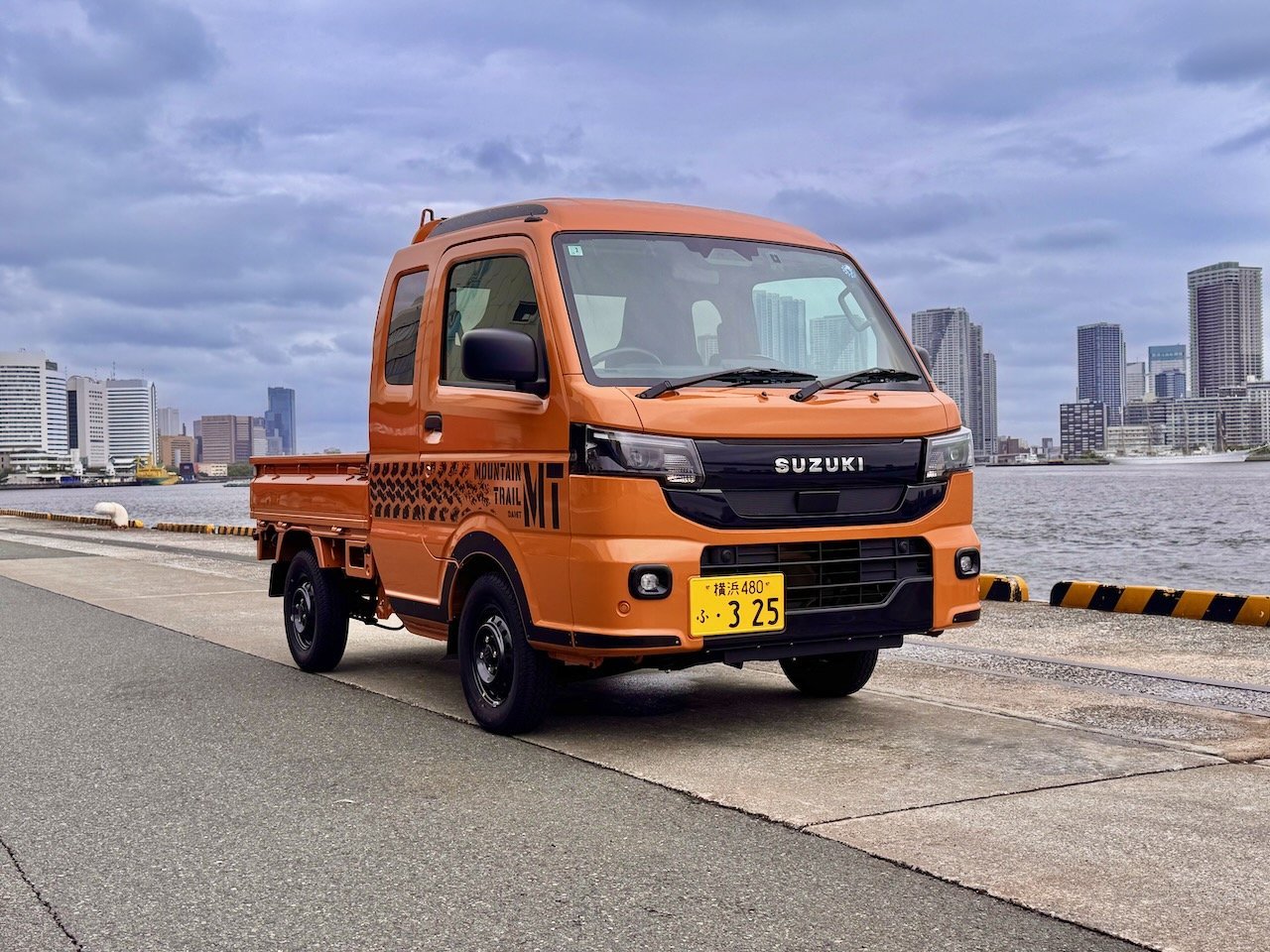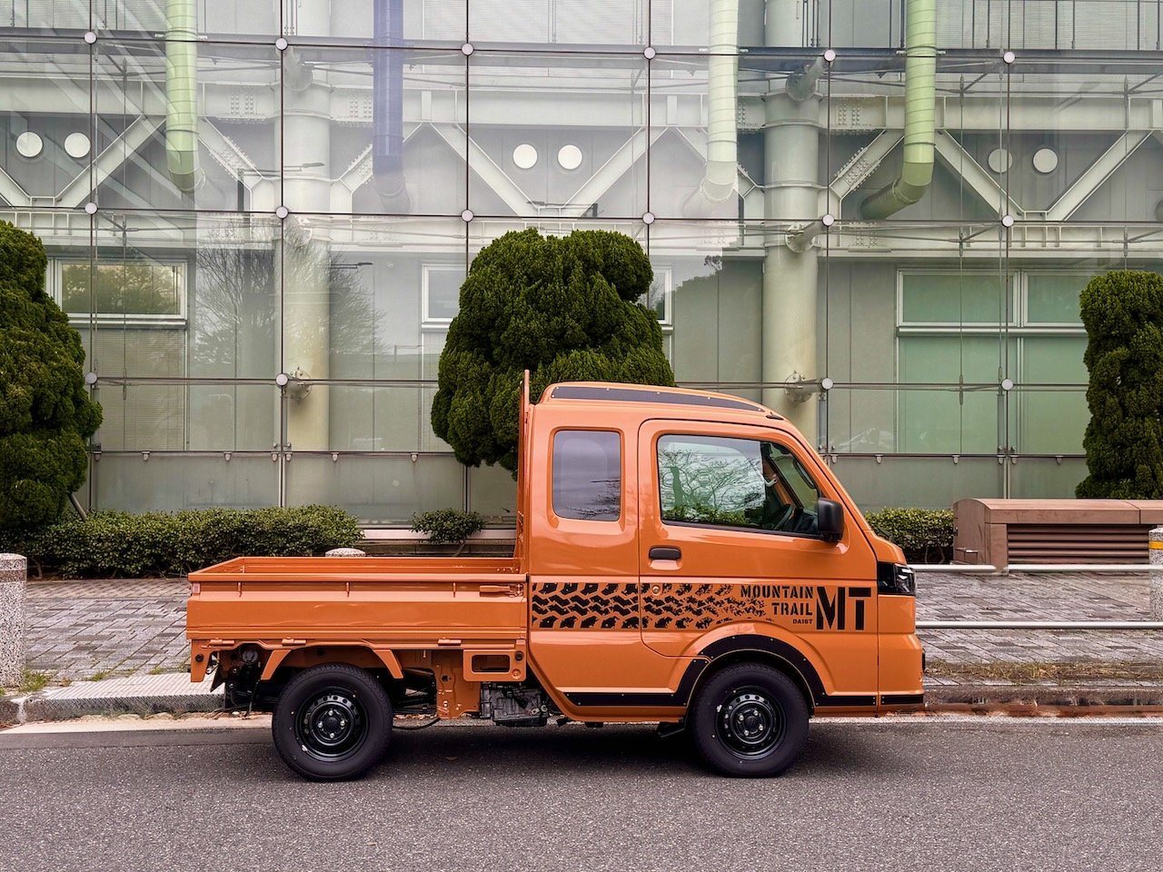 「ツールオレンジ」という車体色に、「MT MOUNTAIN TRAIL」の文字と、タイヤ痕を模したというパターンのデカールで、商用車感はほぼ皆無。