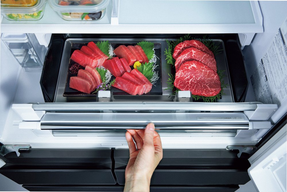 その真空技術が、今回のHZCタイプに「真空氷温ルーム」として復活した。あの懐かしい音はそのままに、食品に冷気を直接当てない間接冷却、密閉構造、そして約マイナス1℃という氷点下から食品が凍り始めるまでの〝氷温環境〟を組み合わせ、酸化や変色を抑えて鮮度を長く保つ。密閉空間である故に冷気の流入を防ぎ、ラップなしでも乾燥しにくい。